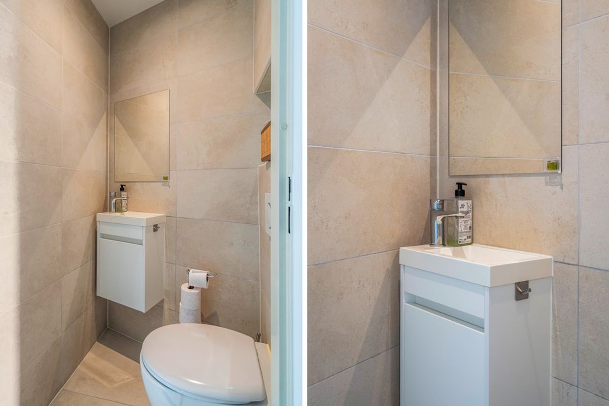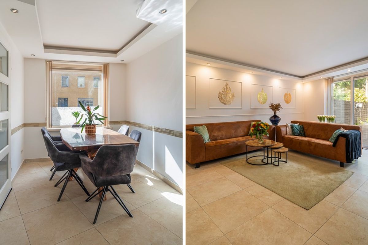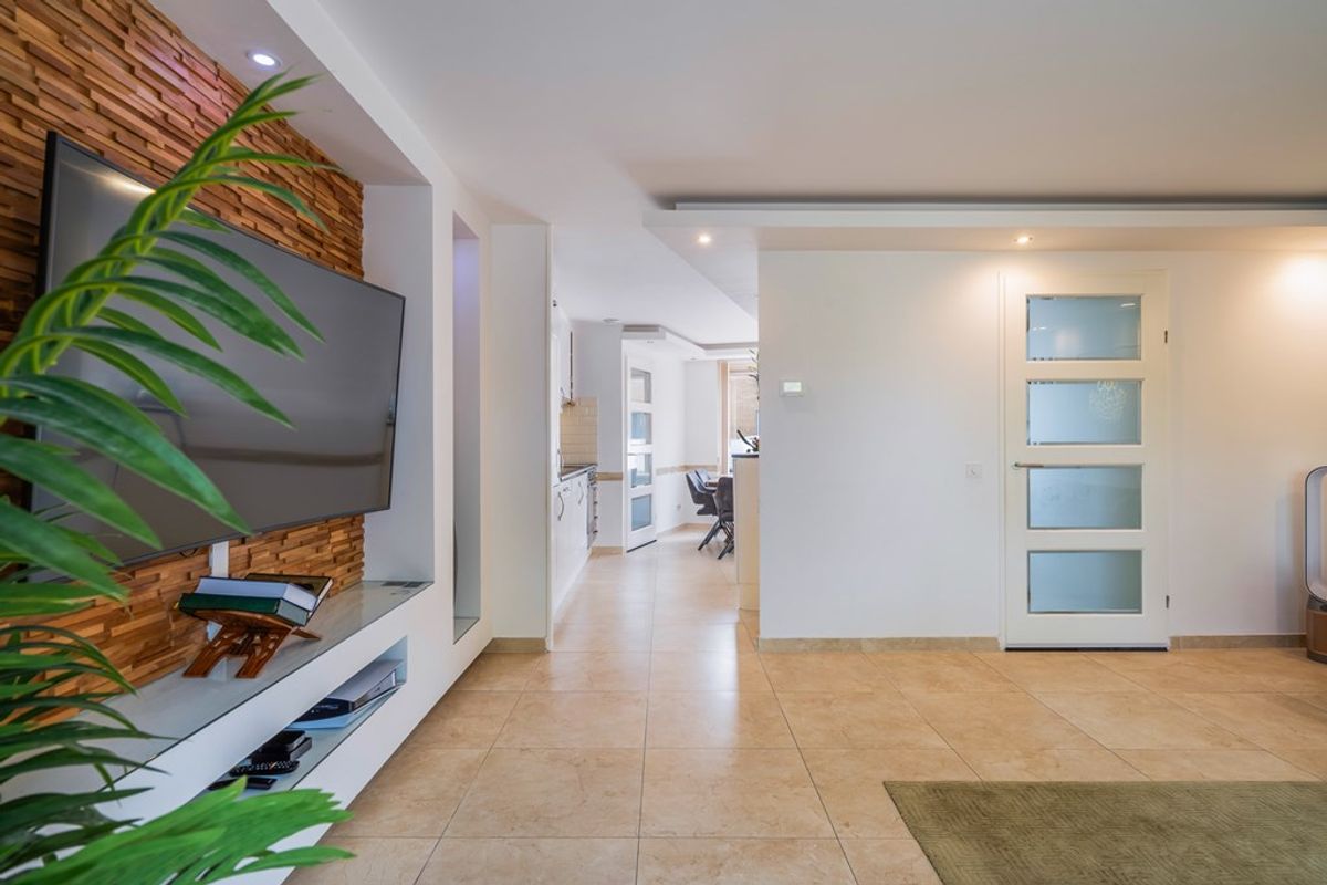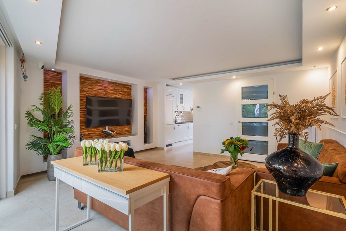 Bij binnenkomst word je meteen verrast door de lichte hal en de nette afwerking. Vanuit hier stap je de royale woonkamer in, een sfeervolle ruimte met strak gestucte wanden en plafond, grote vloertegels en comfortabele vloerverwarming. De speelse indeling geeft de ruimte karakter, terwijl de grote ramen en openslaande deuren zorgen voor een zee aan daglicht. De tuin ligt er uitnodigend bij – perfect voor een ochtendkoffie of lange zomeravond.