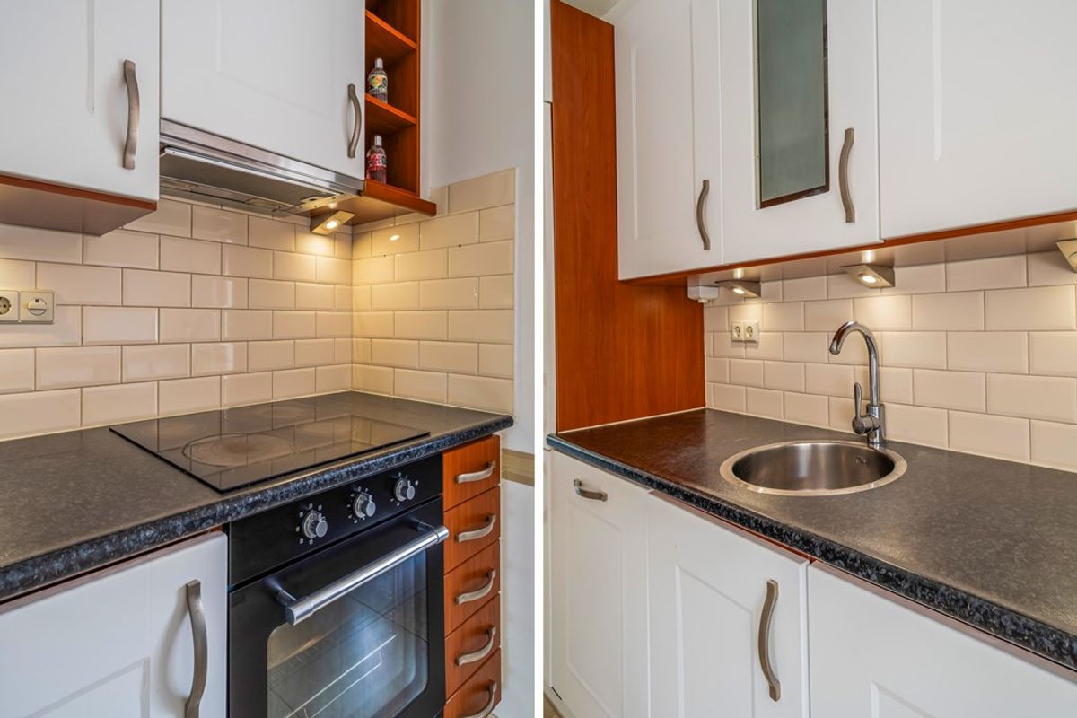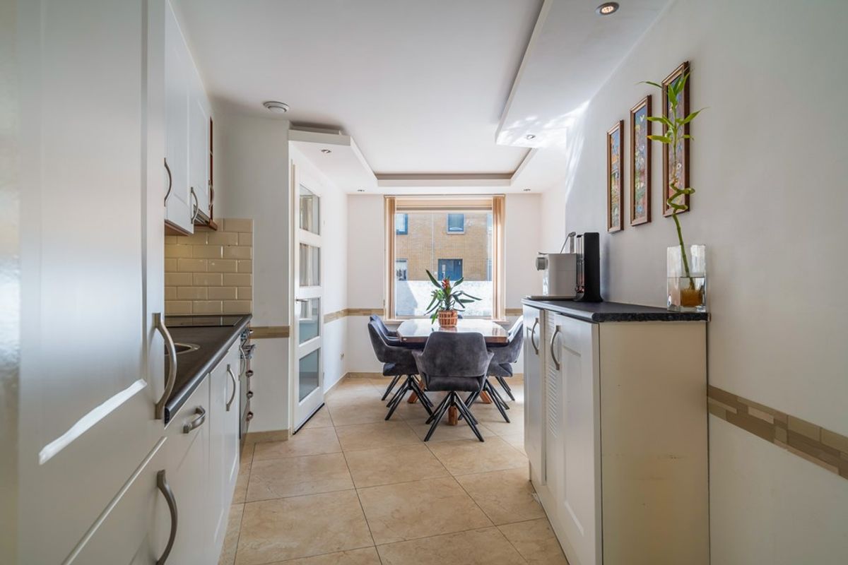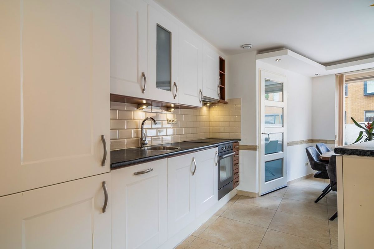 De open keuken aan de voorzijde is een fijne plek om te koken, te kletsen of gewoon lekker bezig te zijn. Het grote raam biedt uitzicht op de rustige straat en laat het daglicht rijkelijk binnen. De keuken is strak, netjes en voorzien van alle benodigde inbouwapparatuur – koken wordt hier vanzelf een plezier.