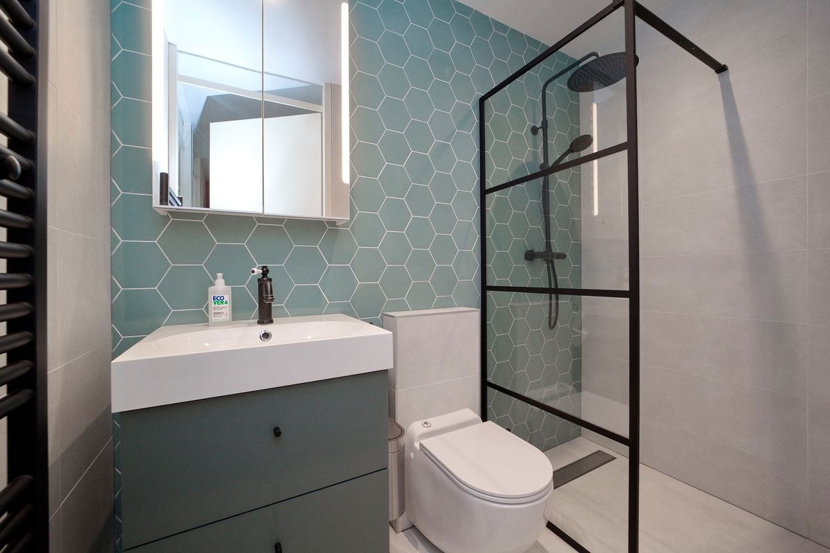 On the first floor, you’ll find the recently renovated modern bathroom with a spacious walk-in shower and glass screen, washbasin with vanity unit, illuminated mirror cabinet, towel radiator, and a second toilet. A separate utility closet accommodates the washing machine and ventilation unit. A guest toilet with washbasin is also available on the ground floor.
