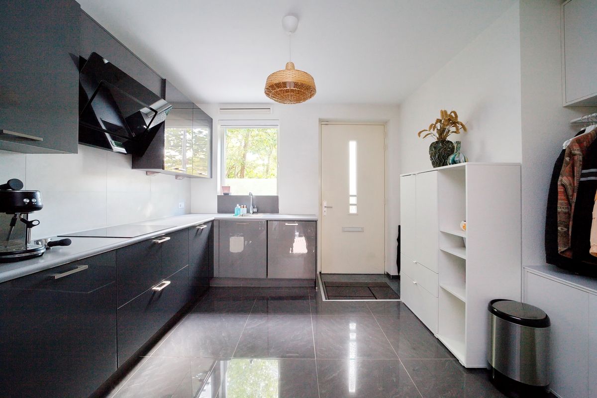 Alle ruimte om heerlijk te koken en kletsen met vrienden aan de eettafel of vanuit de woonkamer. Deze goed formaat keuken, voorzien van dezelfde marmerlook tegelvloer, bevindt zich niet in het midden van de woning (wat standaard is) maar aan de voorzijde van de woning. Hierdoor is er nog meer ruimte ontstaan voor een extra grote keuken en grote eettafel. De keuken biedt voldoende opbergruimte en werkruimte en uiteraard heb je vaatwasser, inductiekookplaat, oven, magnetron, koelkast, vriezer en een recirculatiekap. Van nagenoeg alle gemakken voorzien!