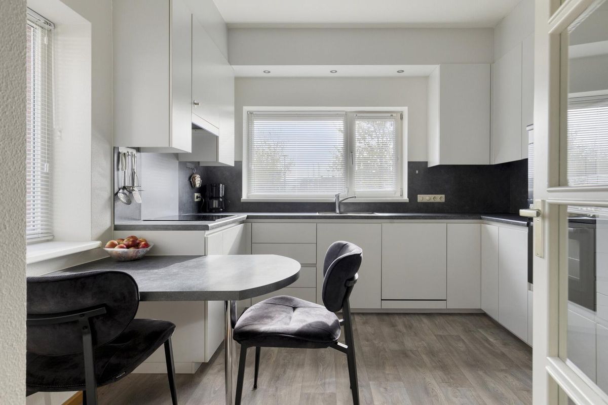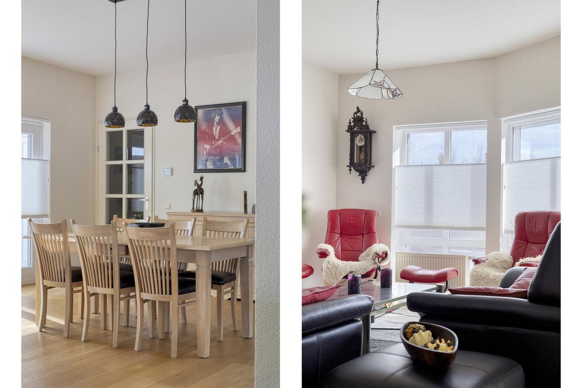 De lichte en royale woonkamer biedt volop leefruimte. De grote raampartijen zorgen voor een fijne lichtinval en een open, ruimtelijk gevoel. In de zomermaanden zet je de schuifdeur open en geniet je van het buitengevoel.