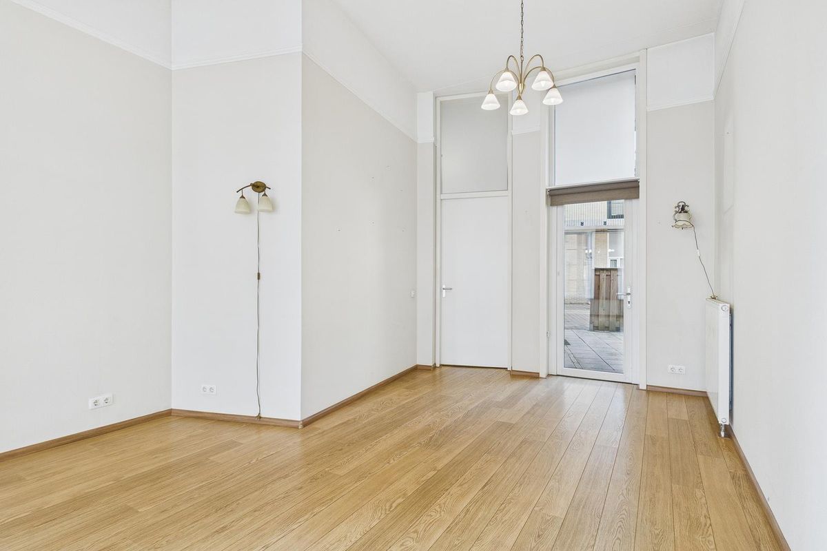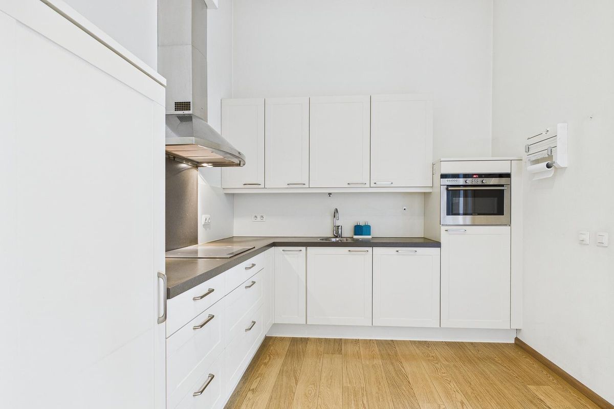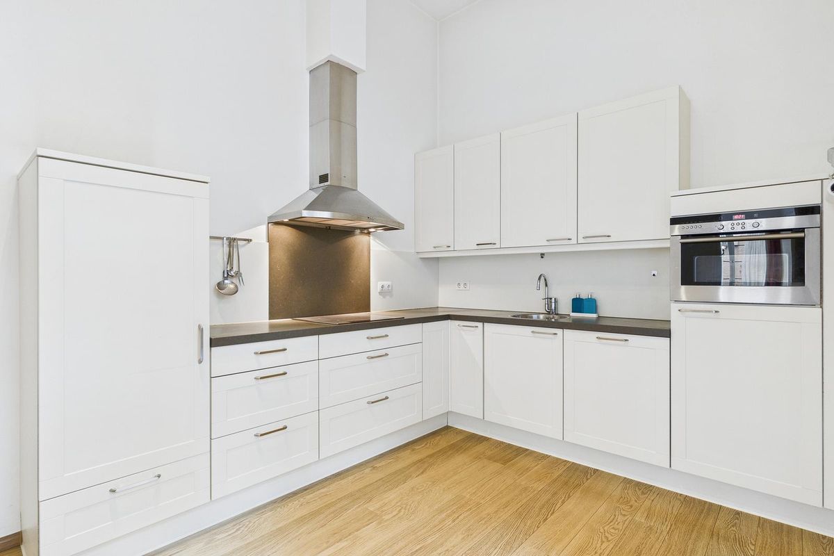 De entree aan de straatzijde leidt naar een ruime hal met meterkast, toilet en een berging/wasruimte. Vanuit hier stap je de lichte woonkamer binnen, voorzien van een nette laminaatvloer en een tuindeur naar het zonnige terras van circa 20 m² – een fijne, beschutte plek midden in de stad. De open keuken sluit aan op de woonkamer en is uitgevoerd in een moderne witte hoekopstelling met inductiekookplaat, afzuigkap, vaatwasser, koelkast en combimagnetron. Ook vanuit de keuken geven dubbele deuren toegang tot het terras.