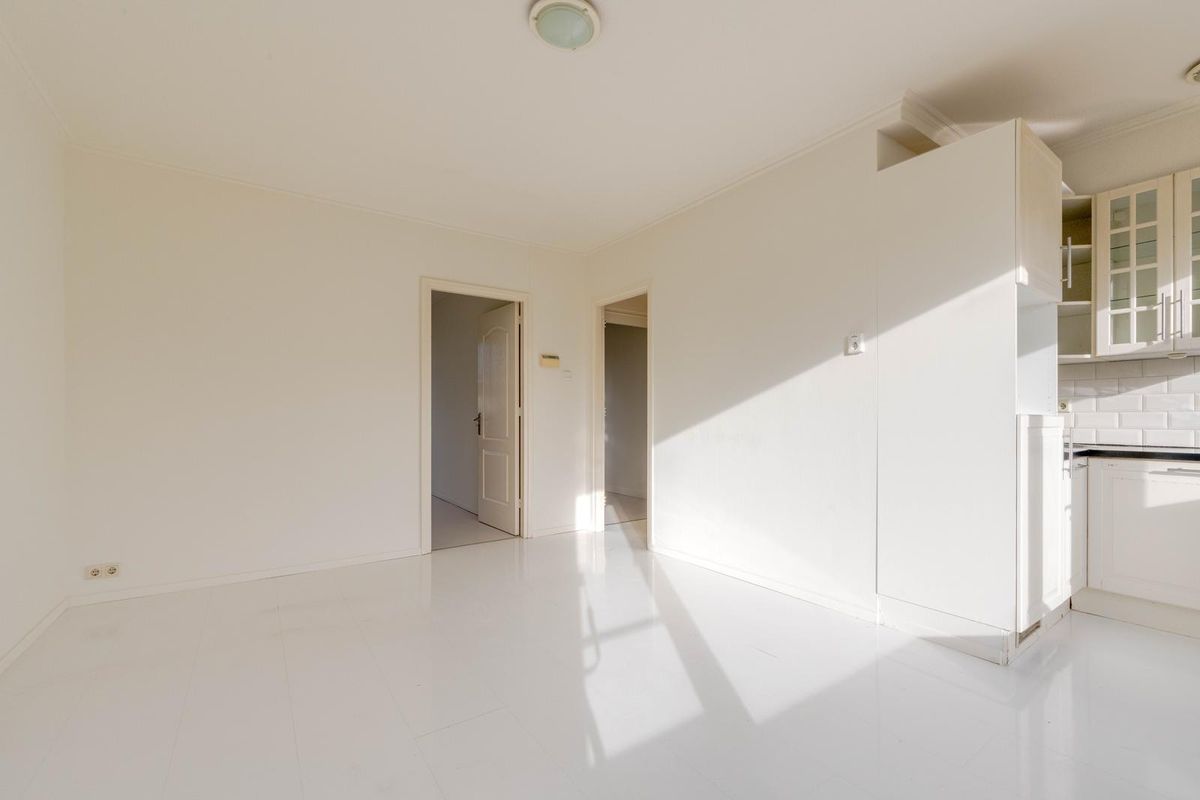 * Woonkamer aan de voorzijde voorzien van laminaatvloer, gestuukte wanden en plafond, deur naar het balkon en open verbinding met de keukenruimte.