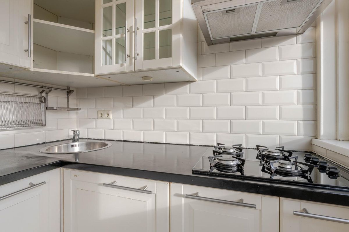 * Keukenruimte aan de voorzijde voorzien van laminaatvloer, hoekinbouwkeuken met een gaskookplaat, schouw afzuigkap, koelkast met vriesvak en vaatwasmachine.