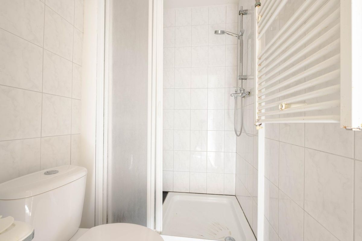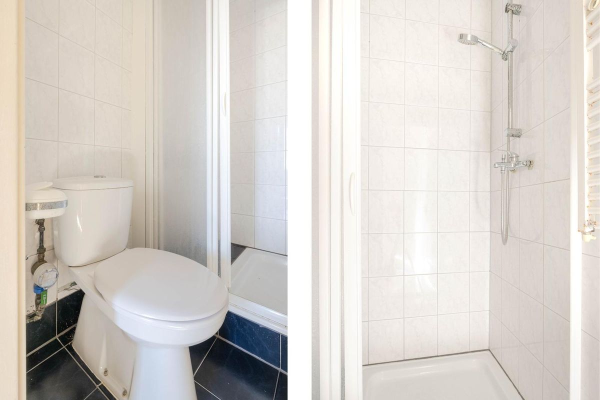 * Badkamer voorzien van lichte betegeling, douchecabine, designradiator en duoblok-toiletopstelling.