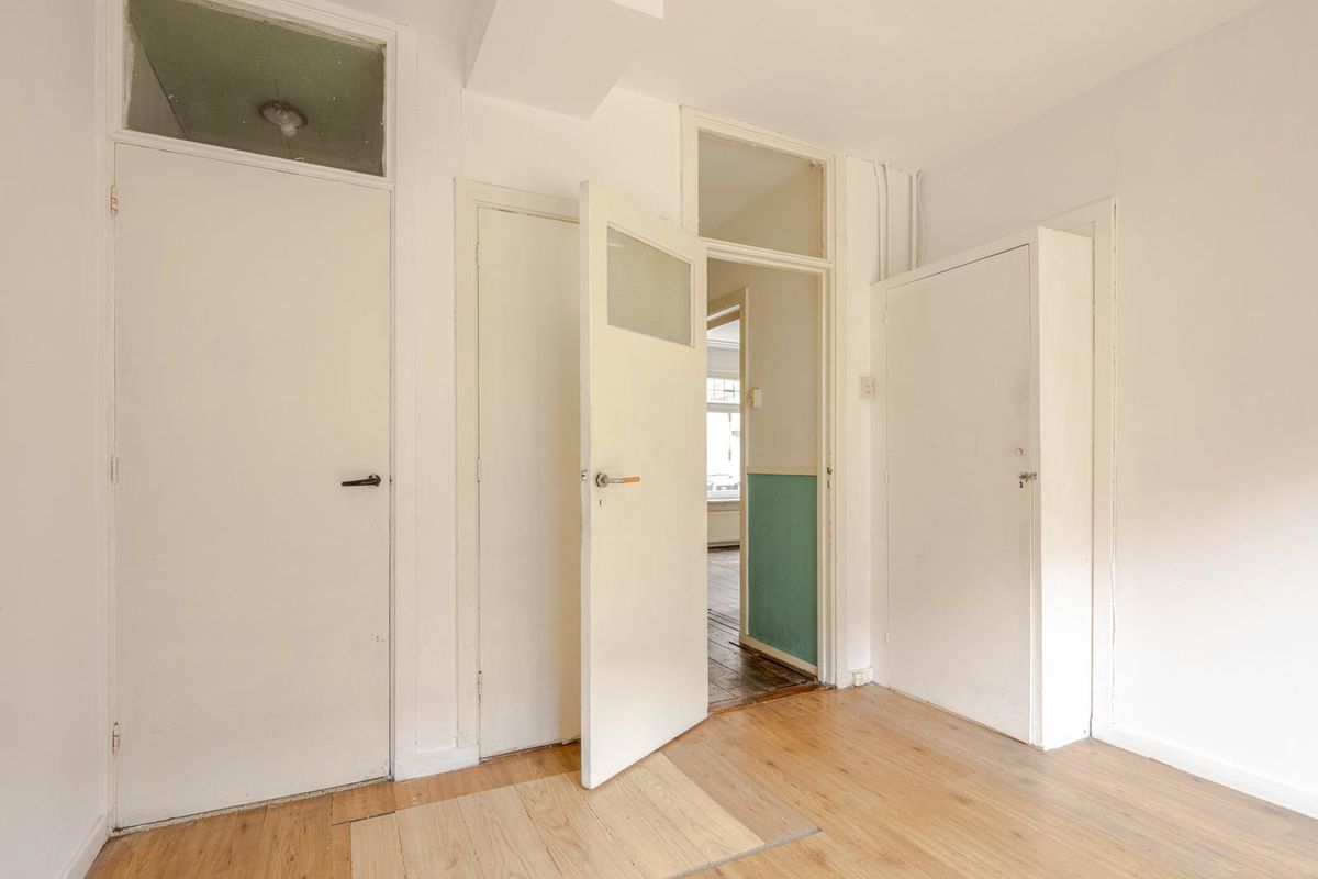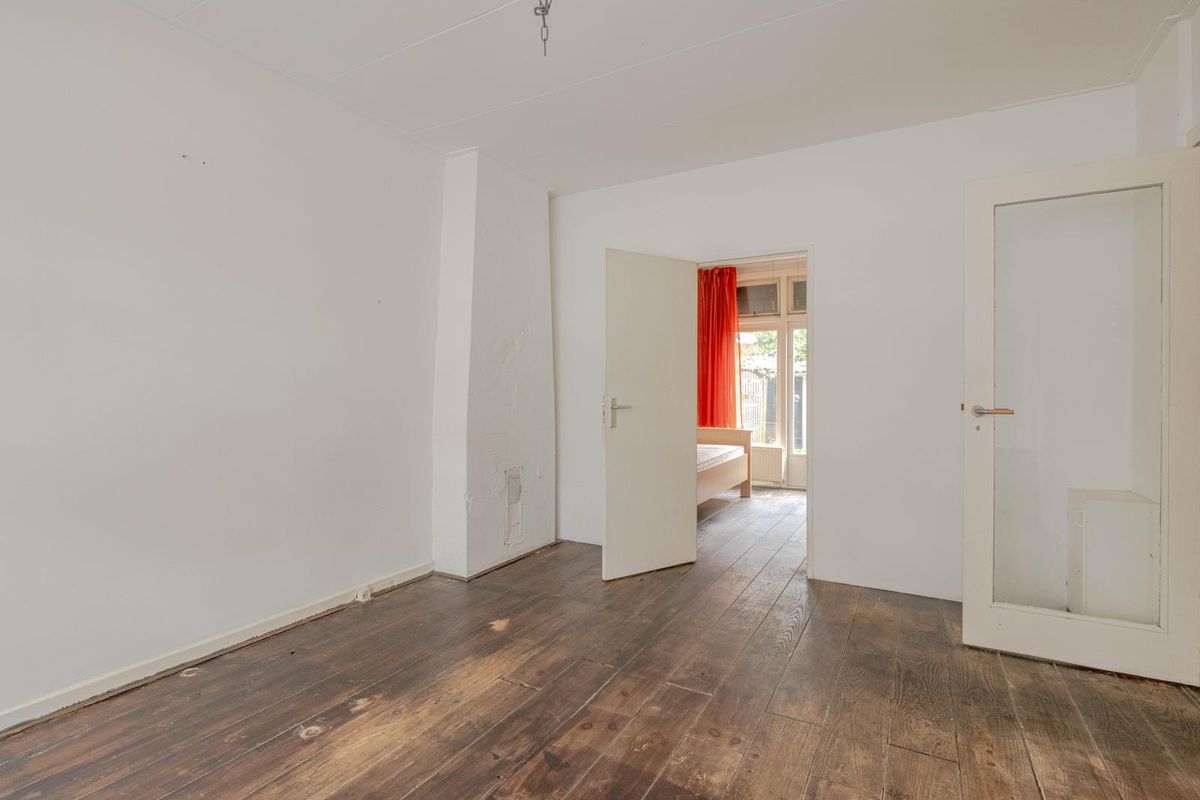 * Woonkamer aan de voorzijde voorzien van houten vloer, gestuukte wanden en gipsplafond en deur naar de slaapkamer aan de achterzijde.