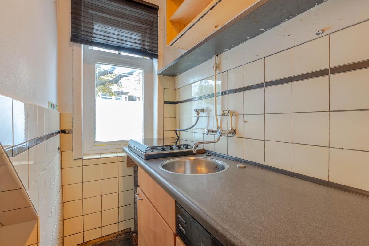 * Keuken voorzien van laminaatvloer, functionele keukenopstelling met gaskookplaat en vaatwasmachine.