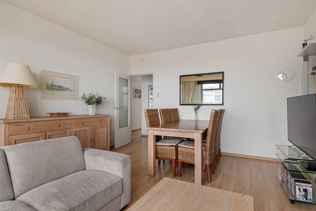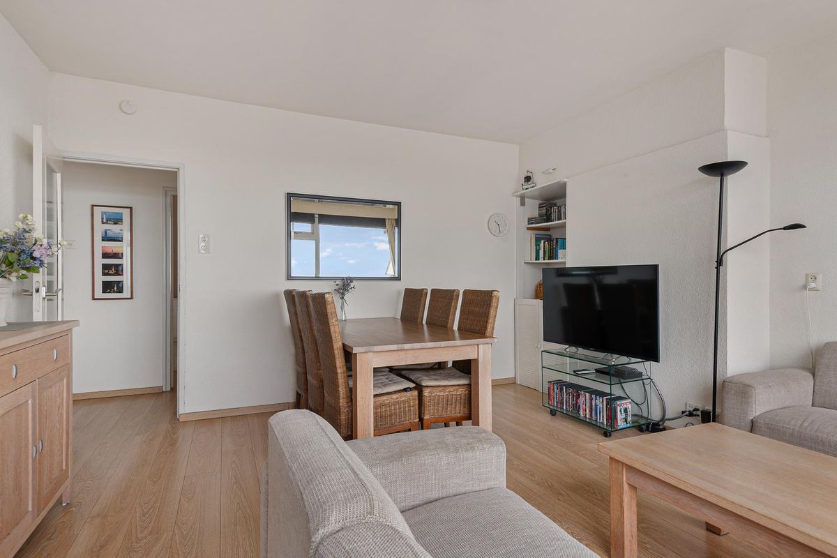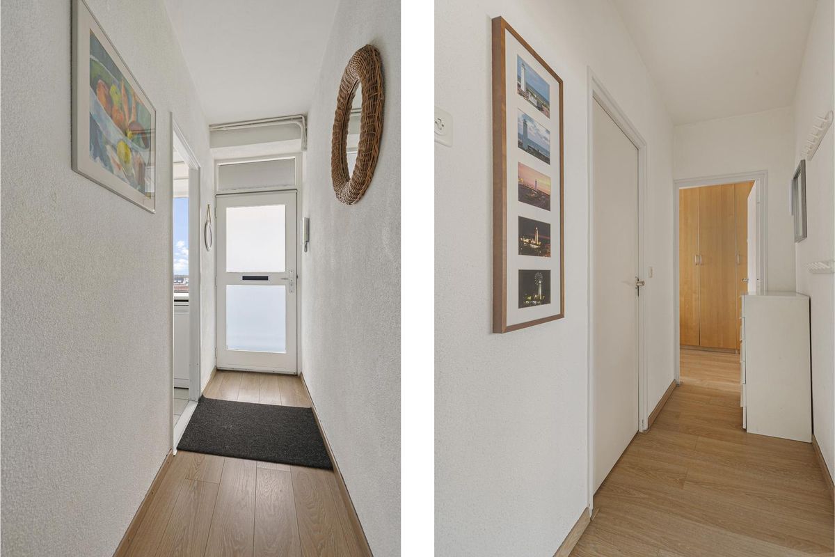 De woonkamer is licht en prettig ingedeeld, met brede raampartijen aan de zeezijde die zorgen voor een open en karakteristiek uitzicht op de markante Vuurtoren van Noordwijk en de Noordzee. De sfeer is rustig en neutraal, met een doorgelegde laminaatvloer in alle woonvertrekken (m.u.v. de badkamers). Het uitzicht wisselt met het weer: van strakblauw en zonsondergangen tot indrukwekkende wolkenvelden.