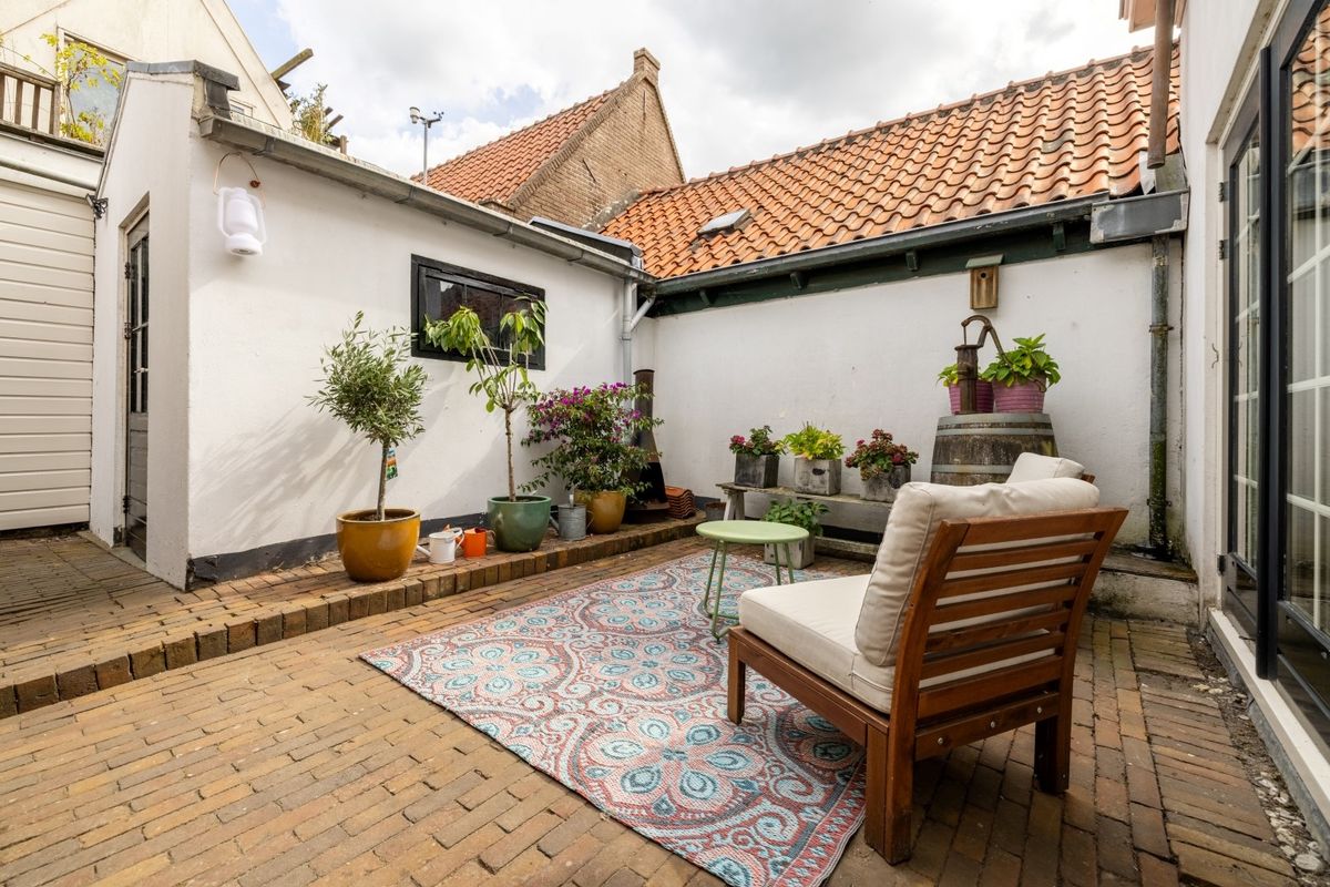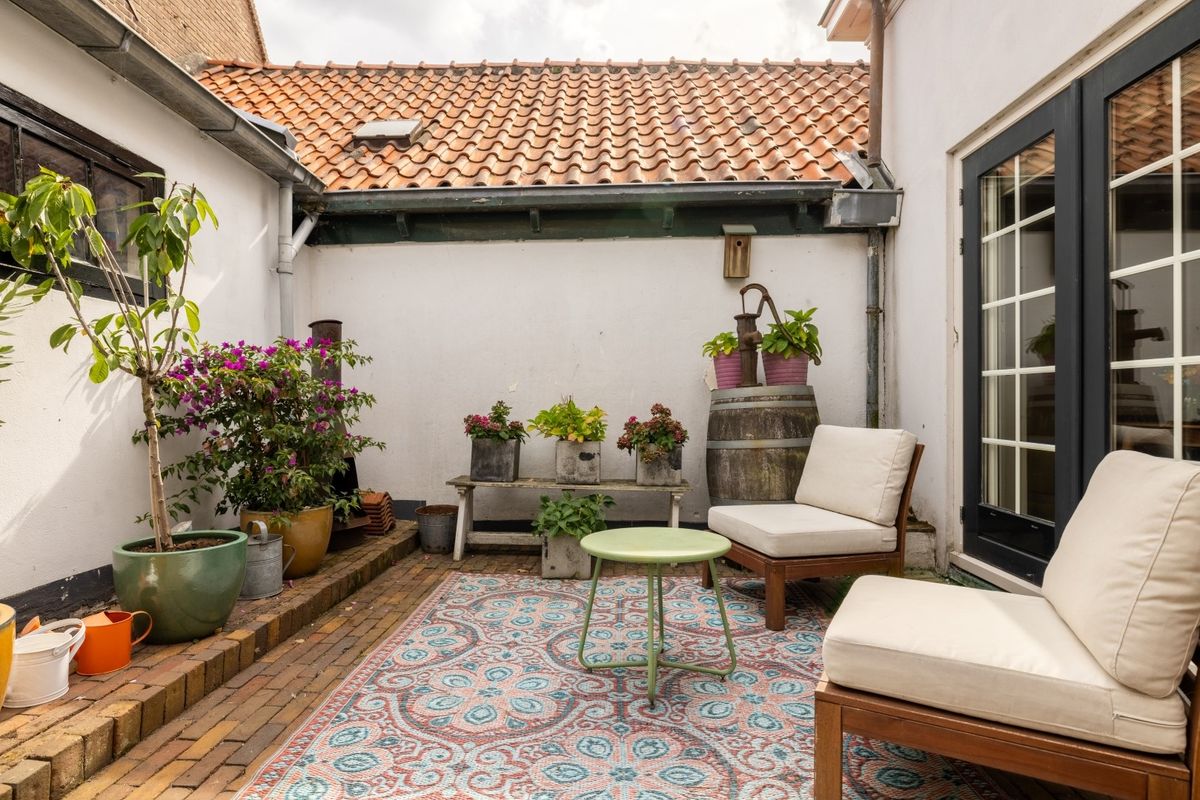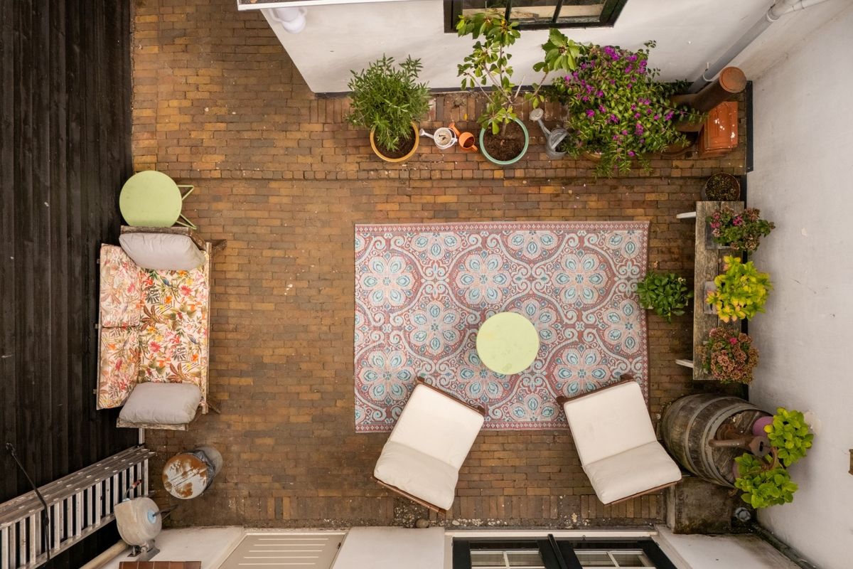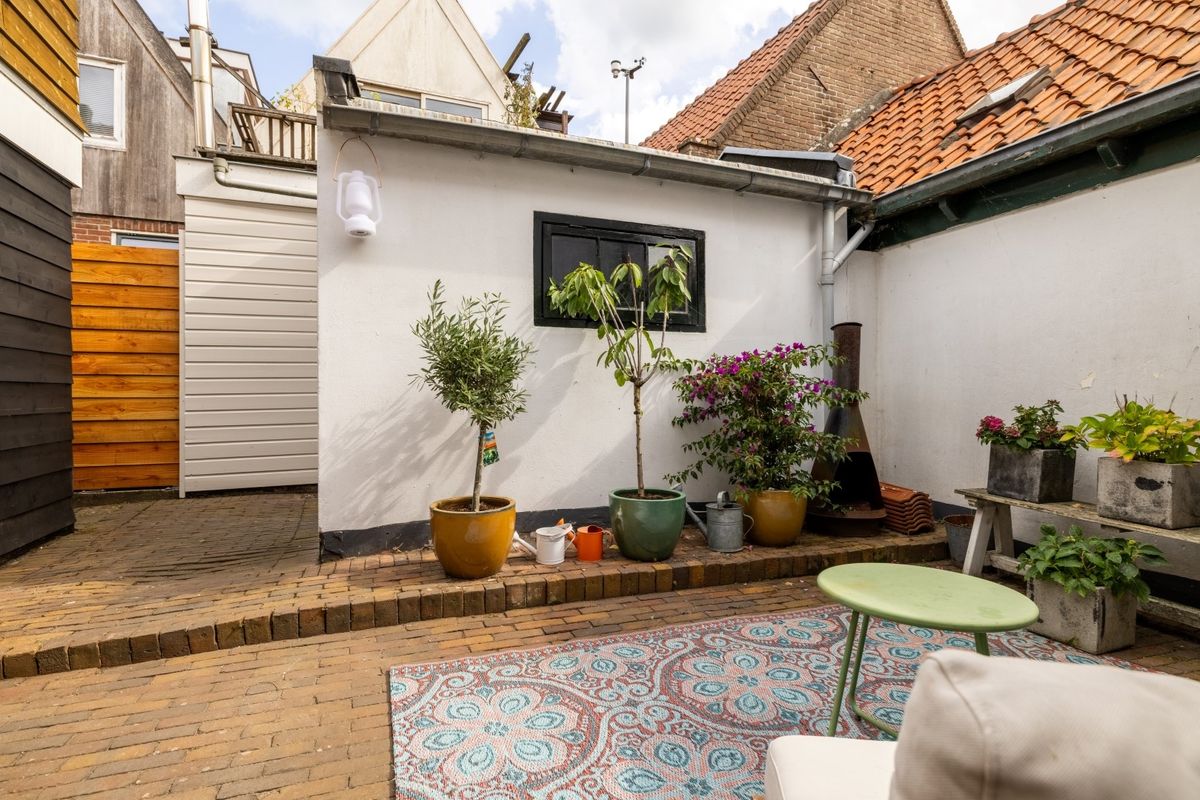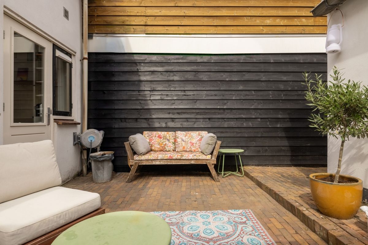 Via de openslaande deuren bereikt u de zonnige stadstuin, een heerlijk rustige plek midden in de stad, met een praktische berging van ca. 7 m² en een achterom.