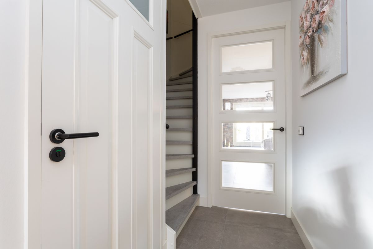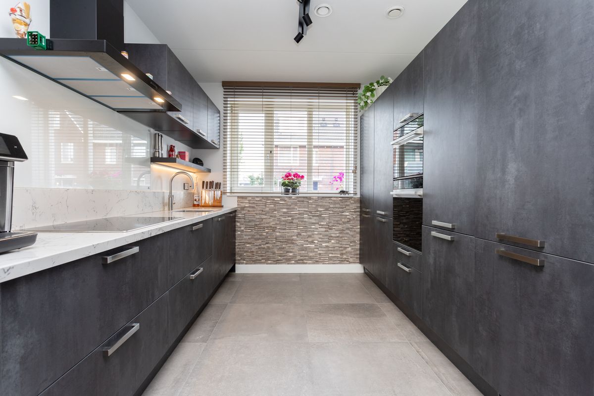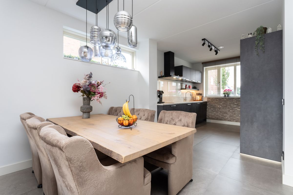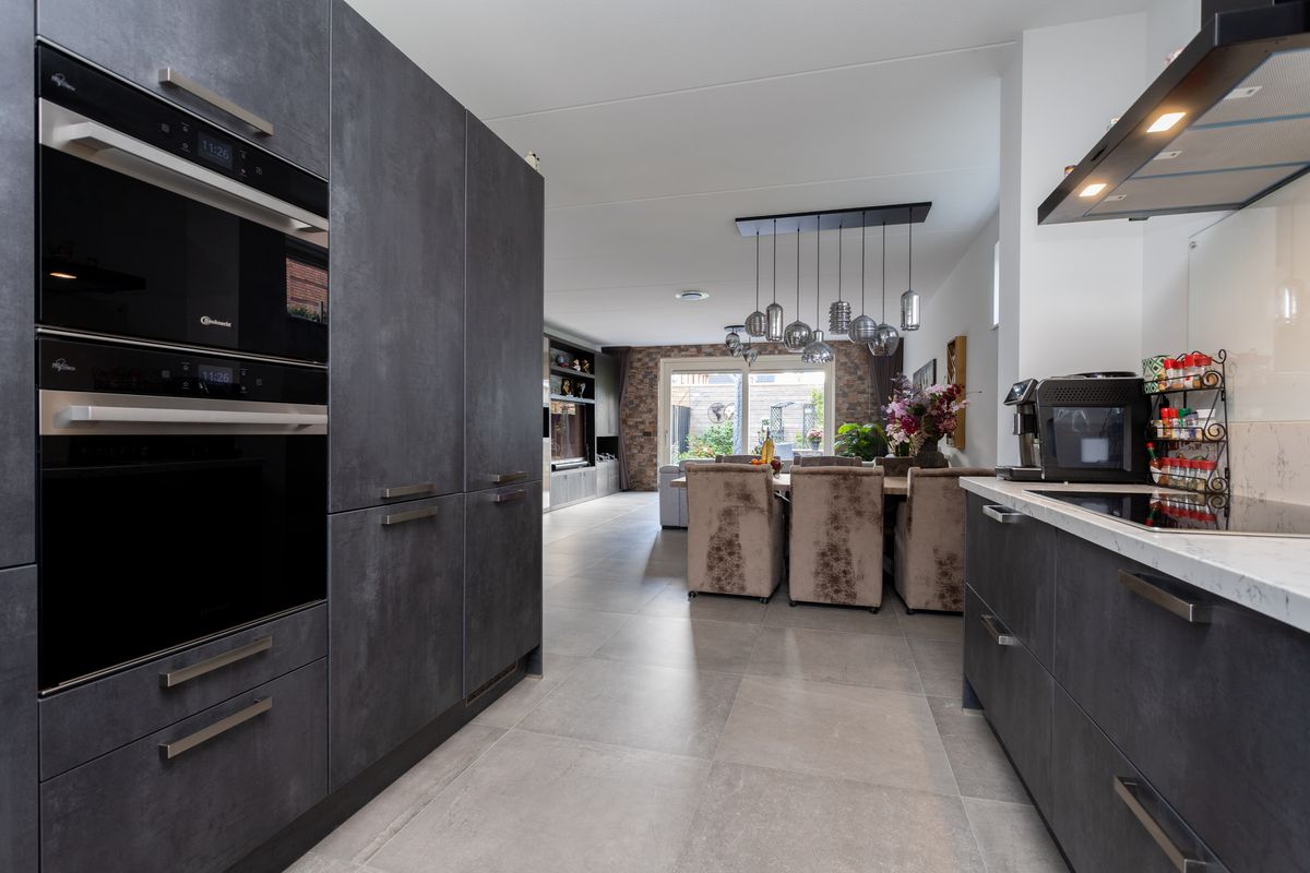 Entree woning, hal met uitgebreide meterkast en luxe toilet met fonteintje en toegang tot de royale living. Bij binnenkomst vallen direct de grote ramen op, heerlijk al dat licht. Op de vloer prachtige keramische tegels. Aan de voorzijde is de luxe open keuken, het ontbreekt u hier aan helemaal niets. Quooker, combi-oven, koelkast vriezer, vaatwasser en een inductie kookplaat.
