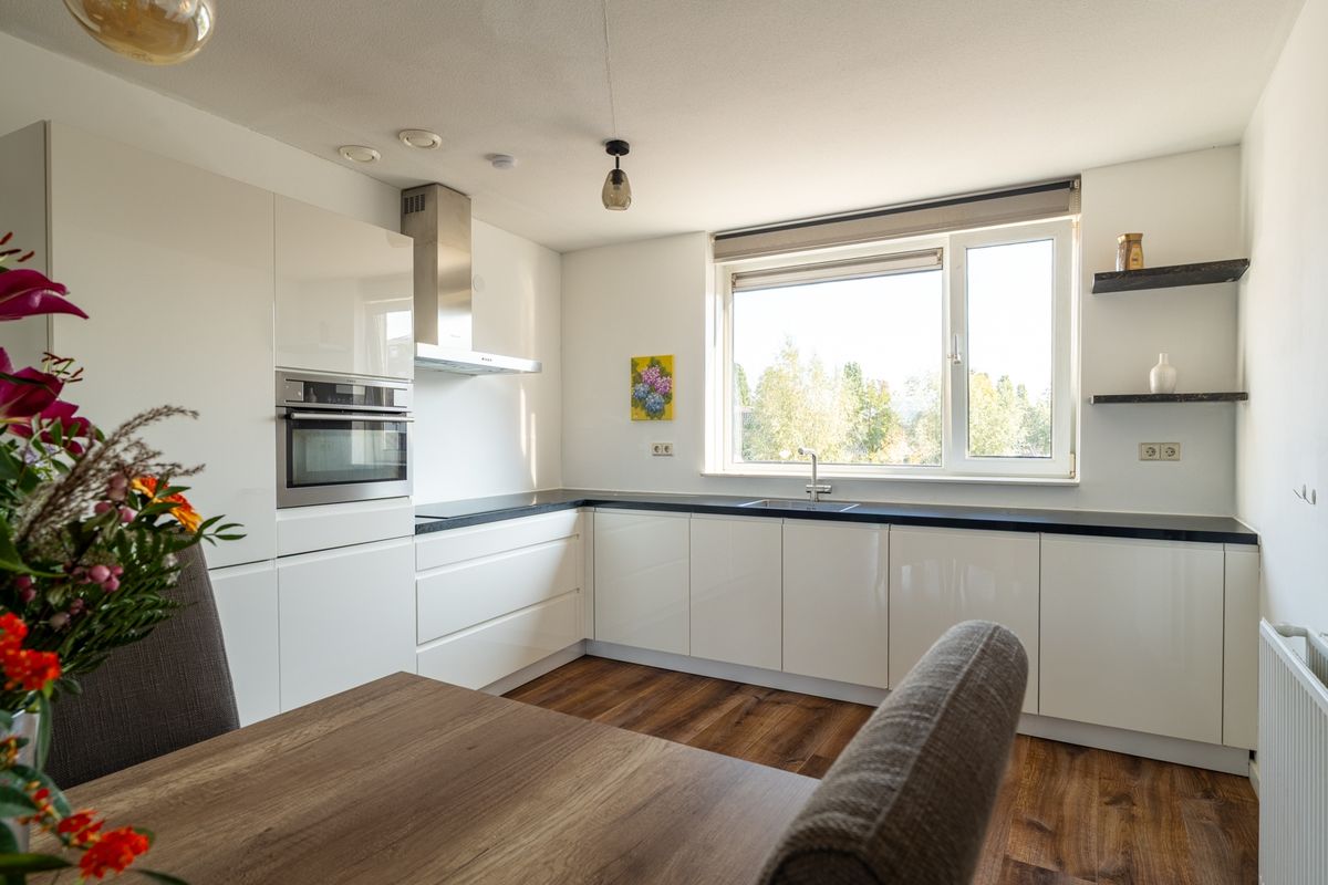 De benedenverdieping voelt direct licht en ruim aan. Grote ramen en een glazen pui zorgen voor veel daglicht en geven toegang tot het dakterras. De woonkamer is daardoor niet alleen gezellig, maar ook een fijne plek om te ontspannen of gasten te ontvangen. De keuken is praktisch ingericht met een grote lichte hoekkeuken voorzien van diverse inbouwapparatuur, zoals een koel-vriescombinatie, oven, inductiekookplaat, afzuigkap en vaatwasser. Echt degelijk en compleet dus.