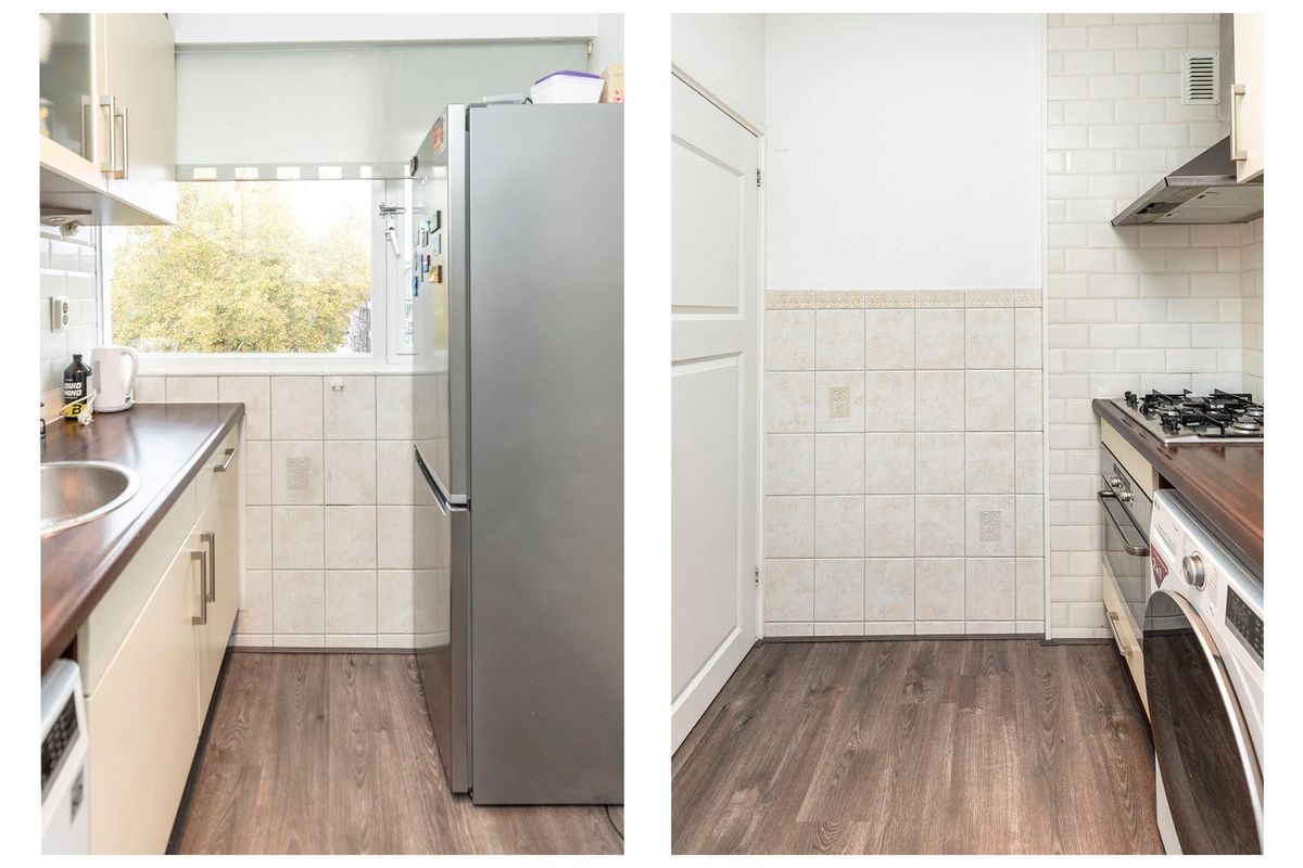 * Aan de voorzijde van de woning bevindt zich keuken in een rechte opstelling en deze is voorzien van een gas-kookplaat, afzuigkap, combimagnetron en hier is ook de wasmachineaansluiting;