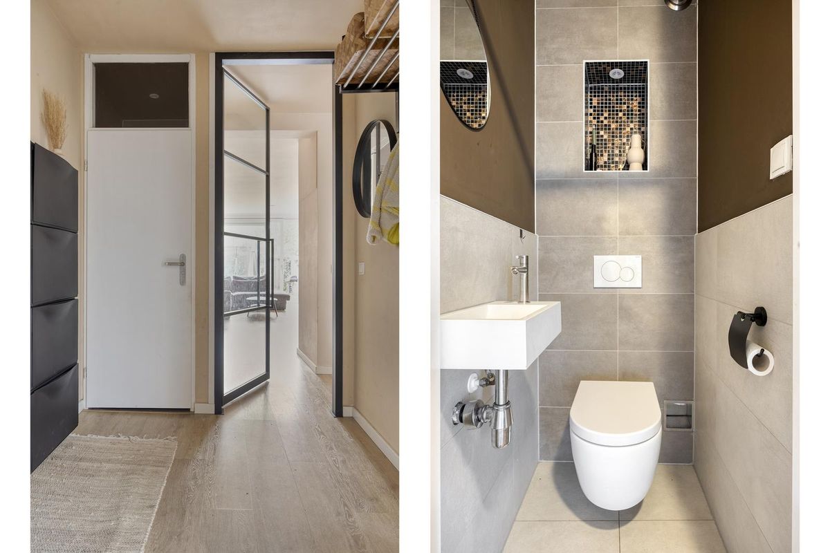 * Hal met modern toilet met fonteintje en toegang tot de berging en de woonkamer;