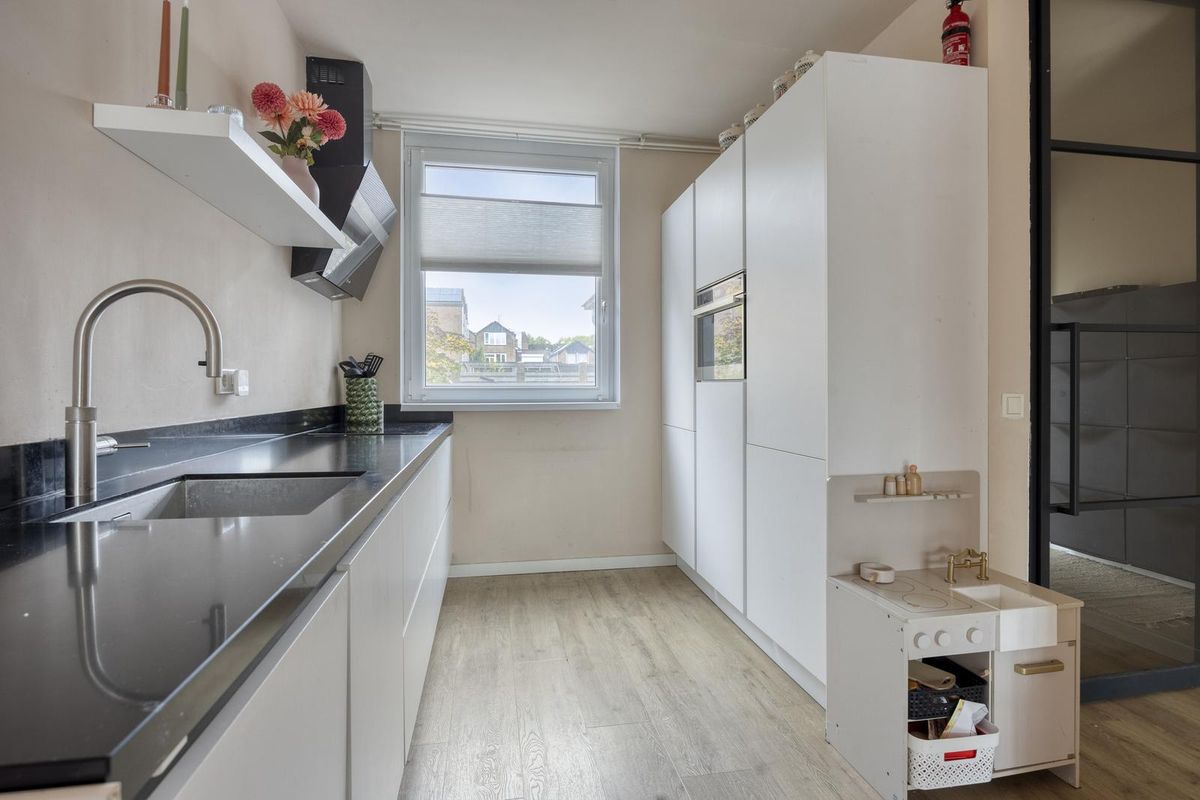 * Halfopen keuken in lichte kleurstelling, voorzien van een 4-pits inductie kookplaat, afzuigkap, combi-oven, koel-/vriescombinatie, vaatwasser en Quooker kraan.