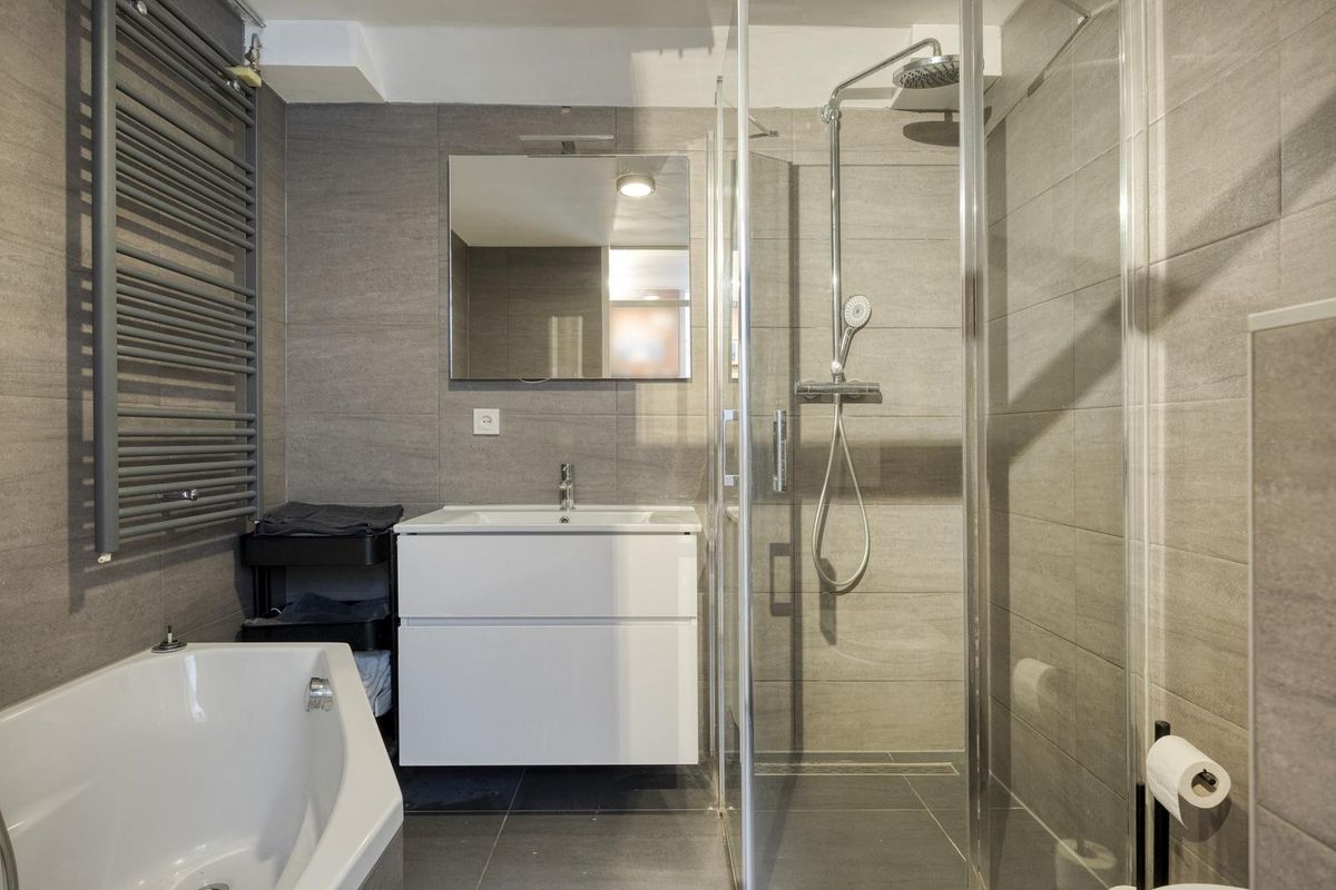 * De moderne badkamer is voorzien van een ligbad, separate douche, wastafelmeubel en toilet.