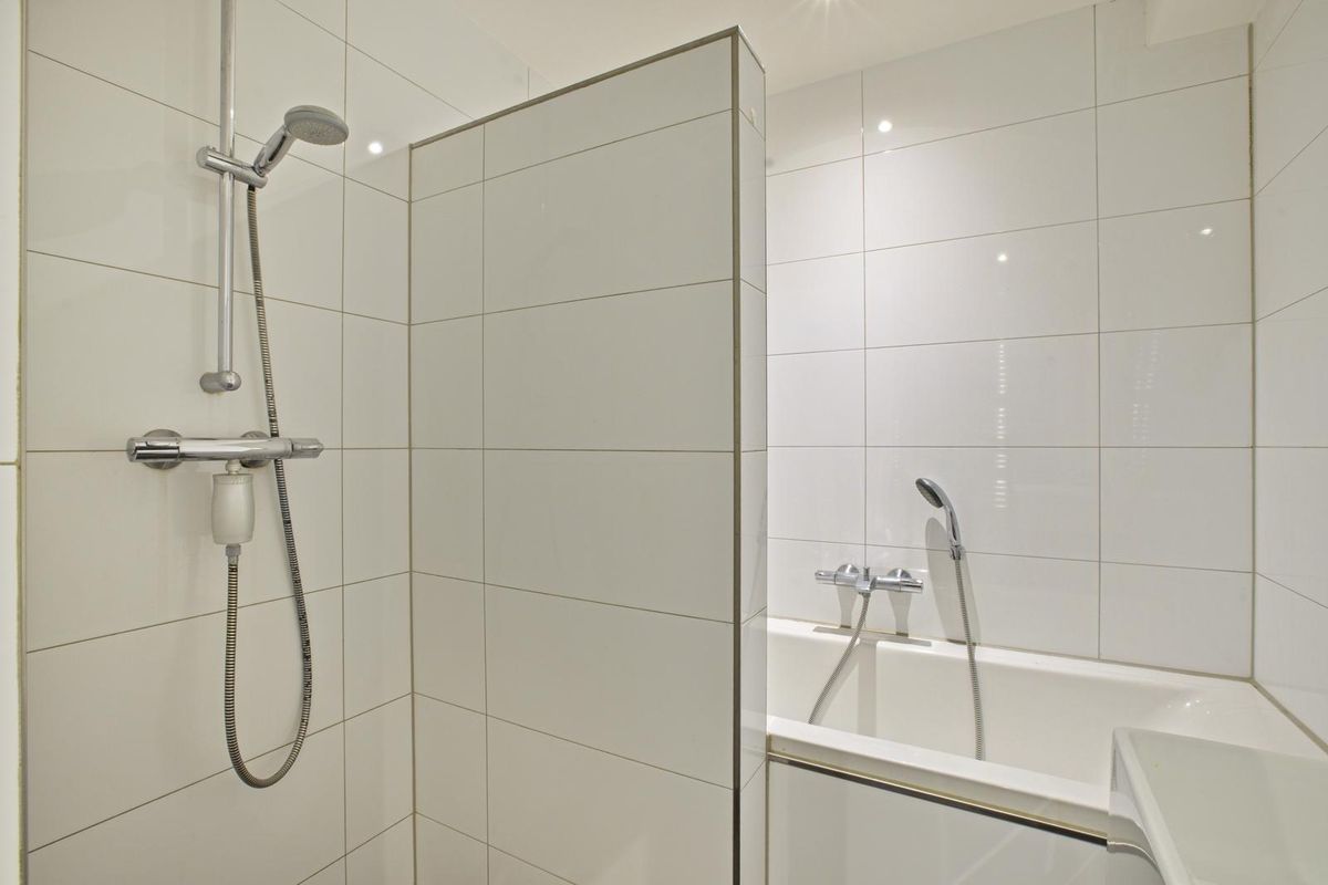 De moderne badkamer is voorzien van een inloopdouche, een dubbele wastafel met wastafelmeubel en een bad. Daarnaast is er ook een separaat toilet.