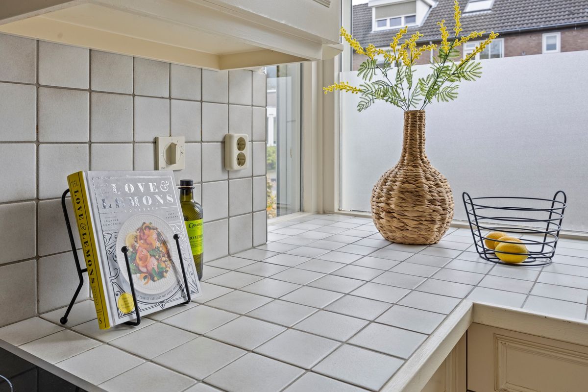 Aan de voorzijde een ruime open keuken in hoekopstelling welke is voorzien van inbouwapparatuur als inductiekookplaat, afzuigkap, oven, koelkast en vaatwasser. Ook de voorzijde van de woning is voorzien van rolluiken.