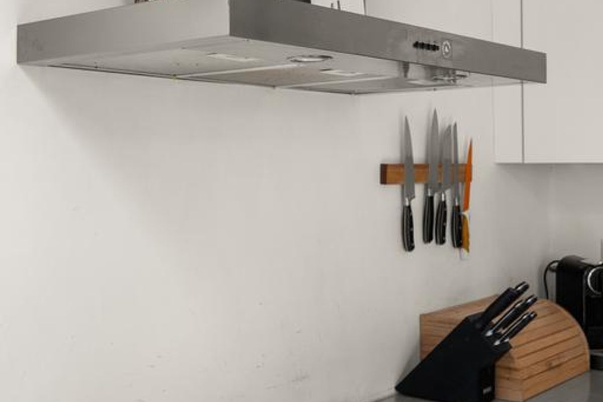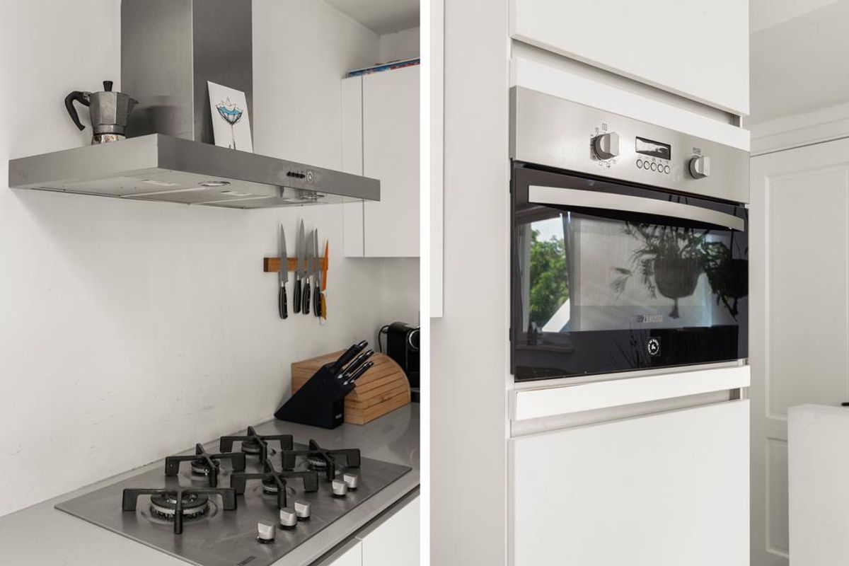 De voordeur van het appartement bevindt zich op de tweede verdieping. De overloop is voorzien van een handige kast waar de jassen kunnen worden opgehangen. Na de laatste trap loop u de grote open woonkeuken.