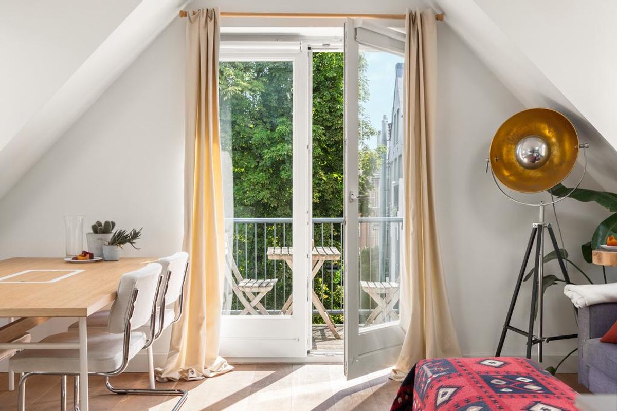 De woonkamer met aangrenzende open keuken is door de vele velux ramen zon overgoten. Daarnaast loop je vanuit de woonkamer zo het balkon op. Het balkon is gelegen aan de achterzijde van de woning met prachtig uitzicht over de binnentuinen van de Govert Flinckstraat. De ligging van het balkon zorgt ervoor dat u de hele dag in privacy van de zon kan genieten.