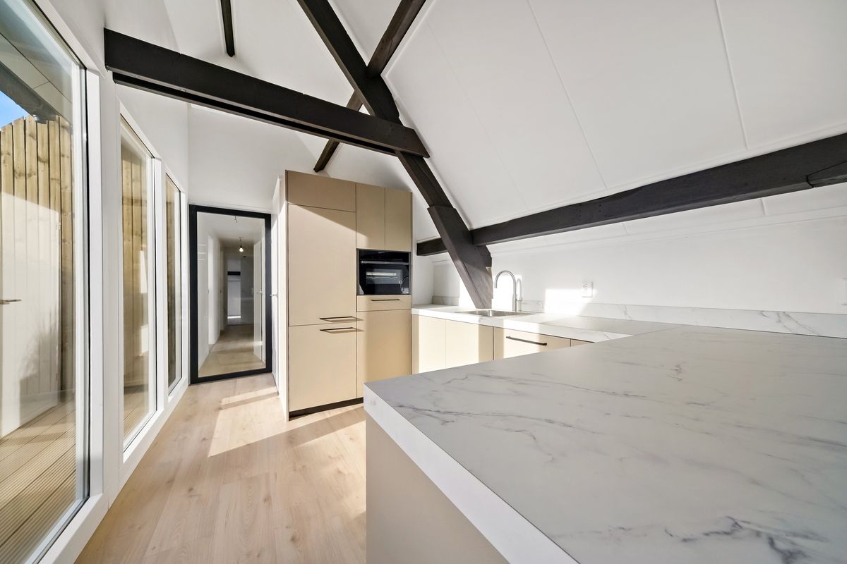 Op de bovenste etage vindt u het lichte vier kamer loftappartement (Penthouse) met onder andere drie slaapkamers, een lichte woonkamer, luxe keuken, moderne badkamer, zonnig dakterras én uw eigen lift. De enorme nokhoogte valt bij binnenkomst direct op. De houten binten worden benadrukt door de aanwezigheid van gestucte wanden. Dankzij de grote raampartijen zijn alle ruimtes in het appartement heerlijk licht.