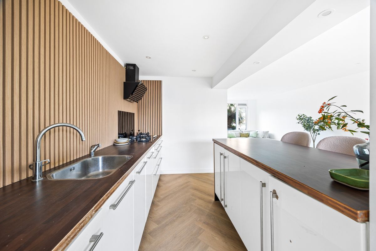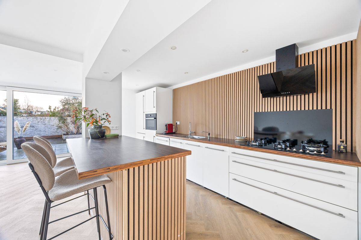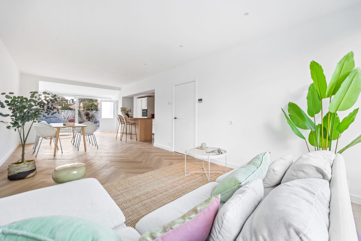 The generous living room is very bright, and the open kitchen truly forms part of this living space. The full-width sliding doors seamlessly connect the garden to the living room.