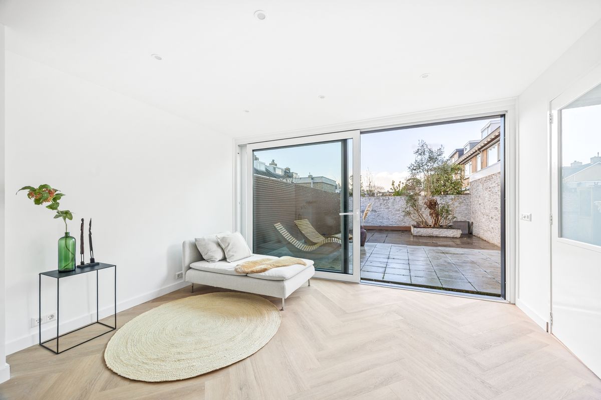 · De lichte woonkamer (inclusief uitbouw) met schuifpui naar de tuin.