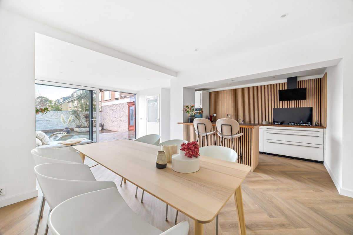 De ruime woonkamer is zeer licht en de open keuken maakt echt onderdeel uit van deze leefruimte. De schuifpui over de gehele breedte betrekt de tuin ook bij de woonkamer.