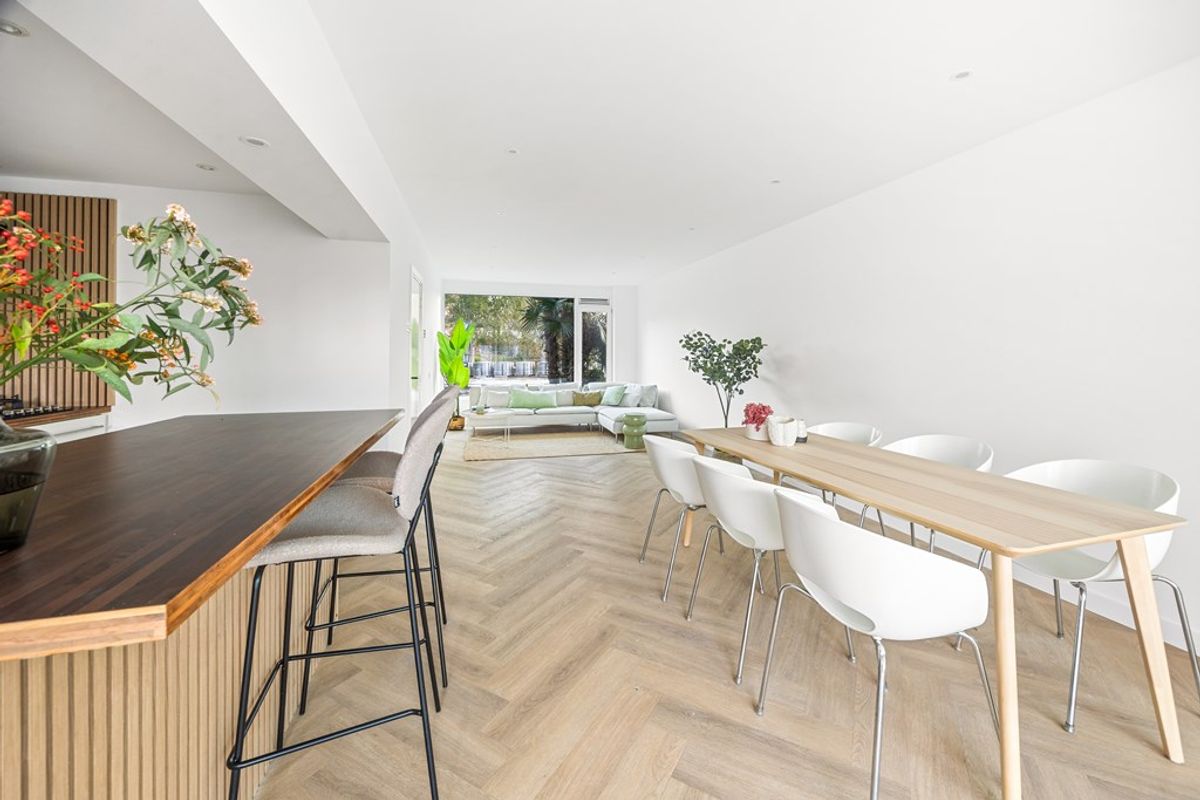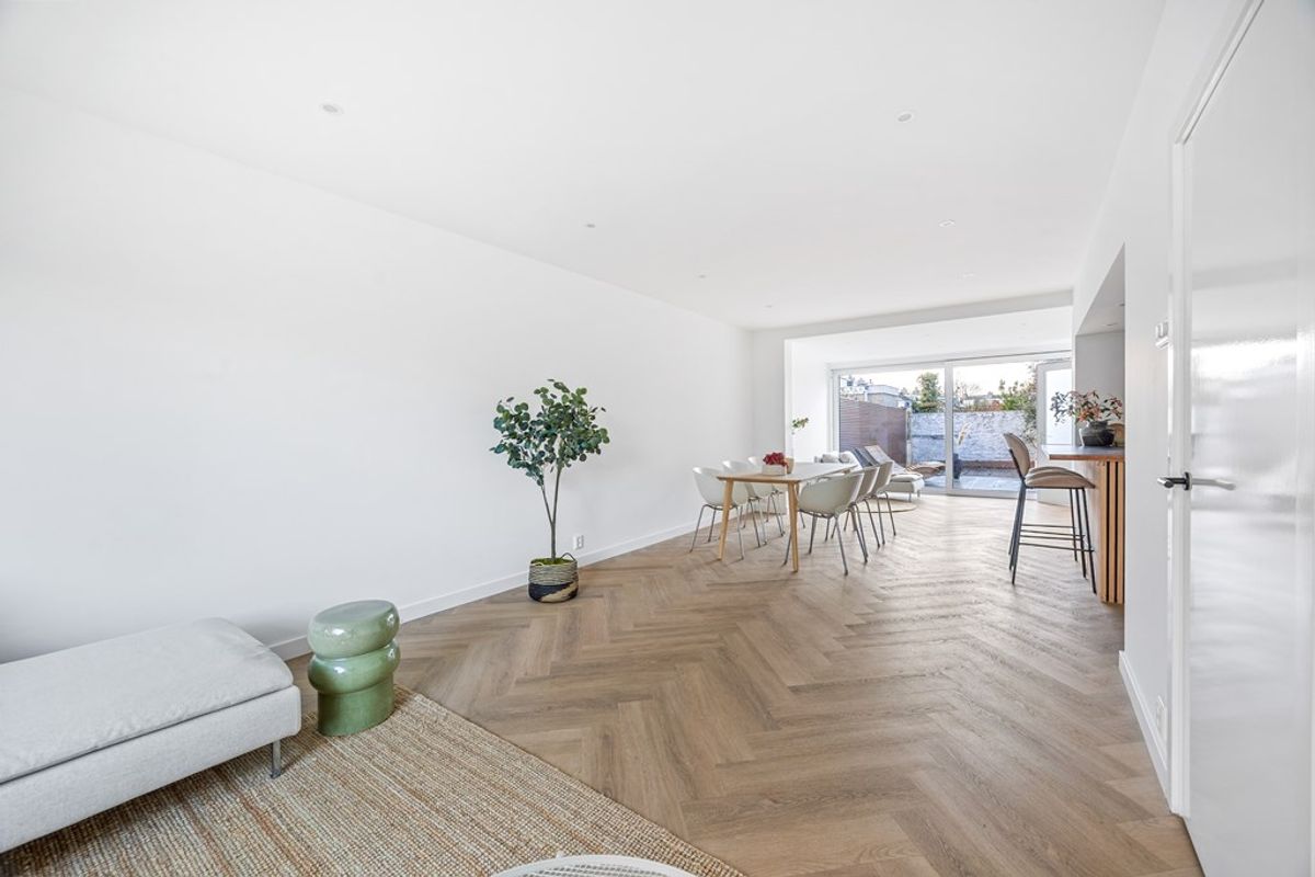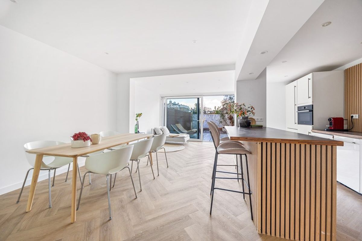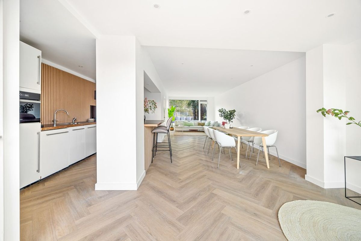 De ruime woonkamer is zeer licht en de open keuken maakt echt onderdeel uit van deze leefruimte. De schuifpui over de gehele breedte betrekt de tuin ook bij de woonkamer.