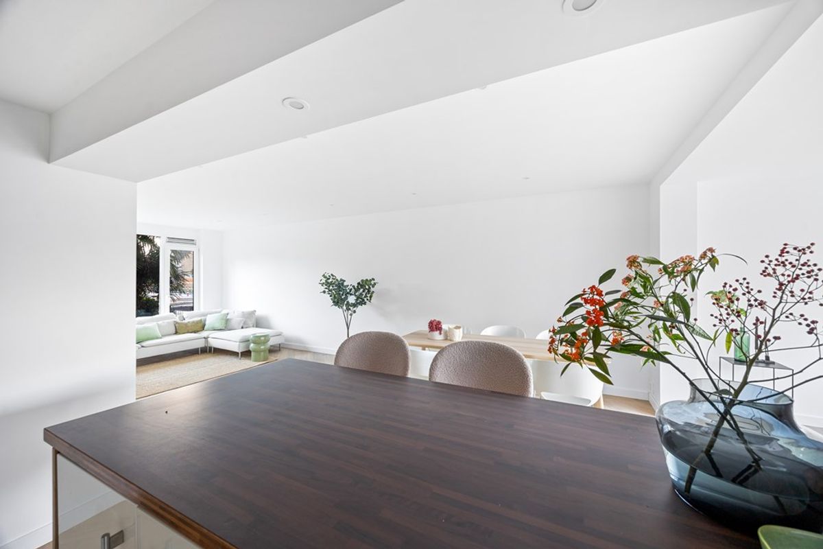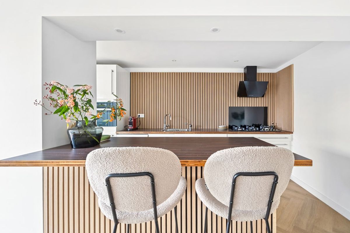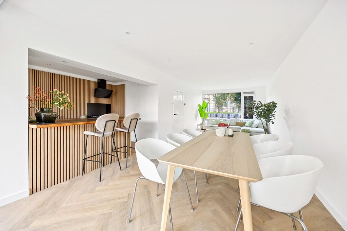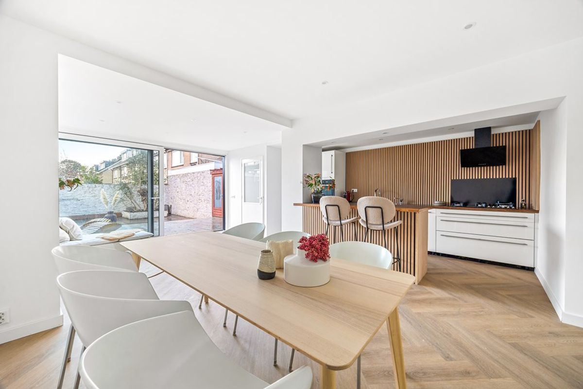 De ruime woonkamer is zeer licht en de open keuken maakt echt onderdeel uit van deze leefruimte. De schuifpui over de gehele breedte betrekt de tuin ook bij de woonkamer.