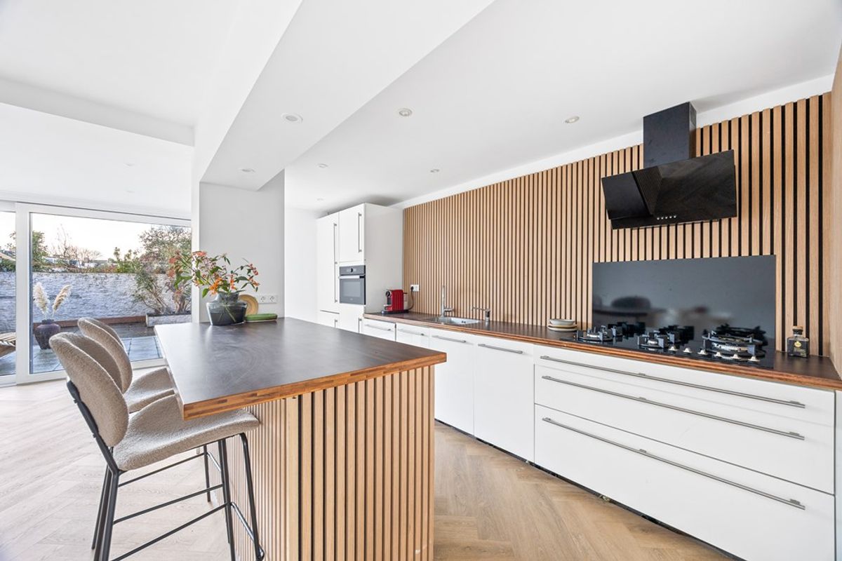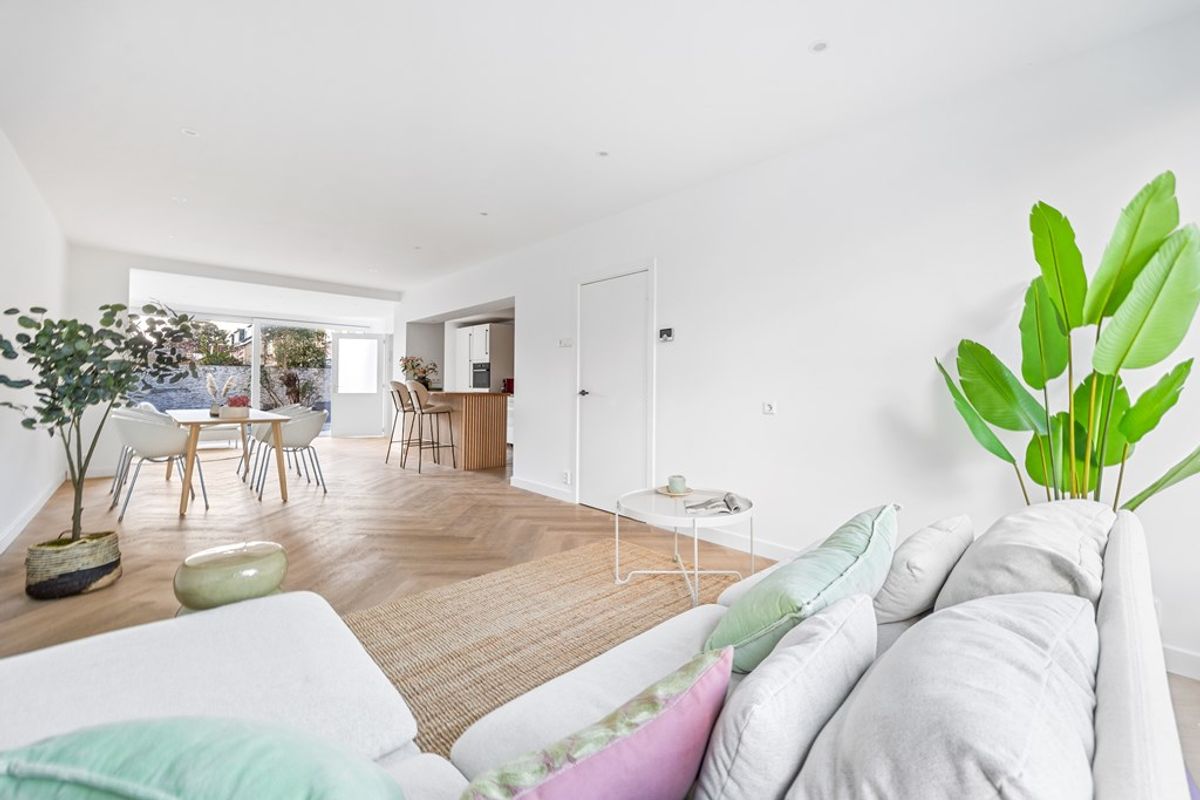 The generous living room is very bright, and the open kitchen truly forms part of this living space. The full-width sliding doors seamlessly connect the garden to the living room.