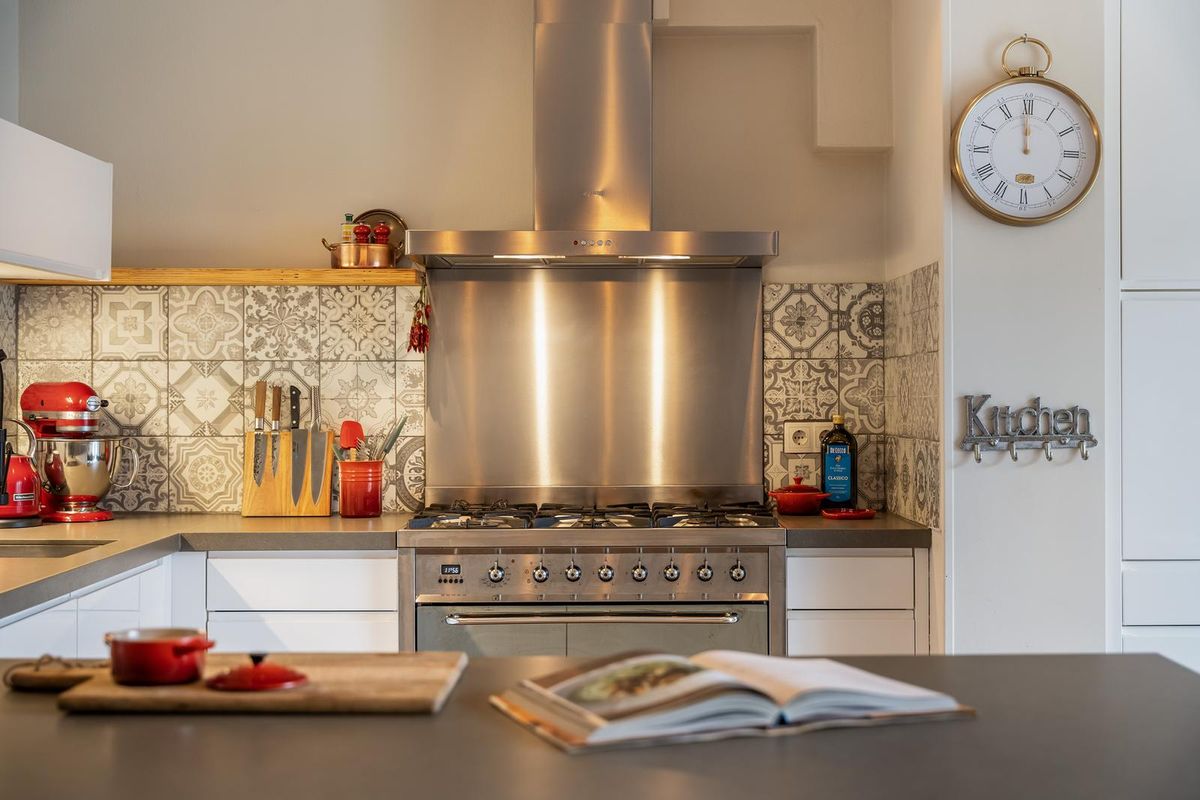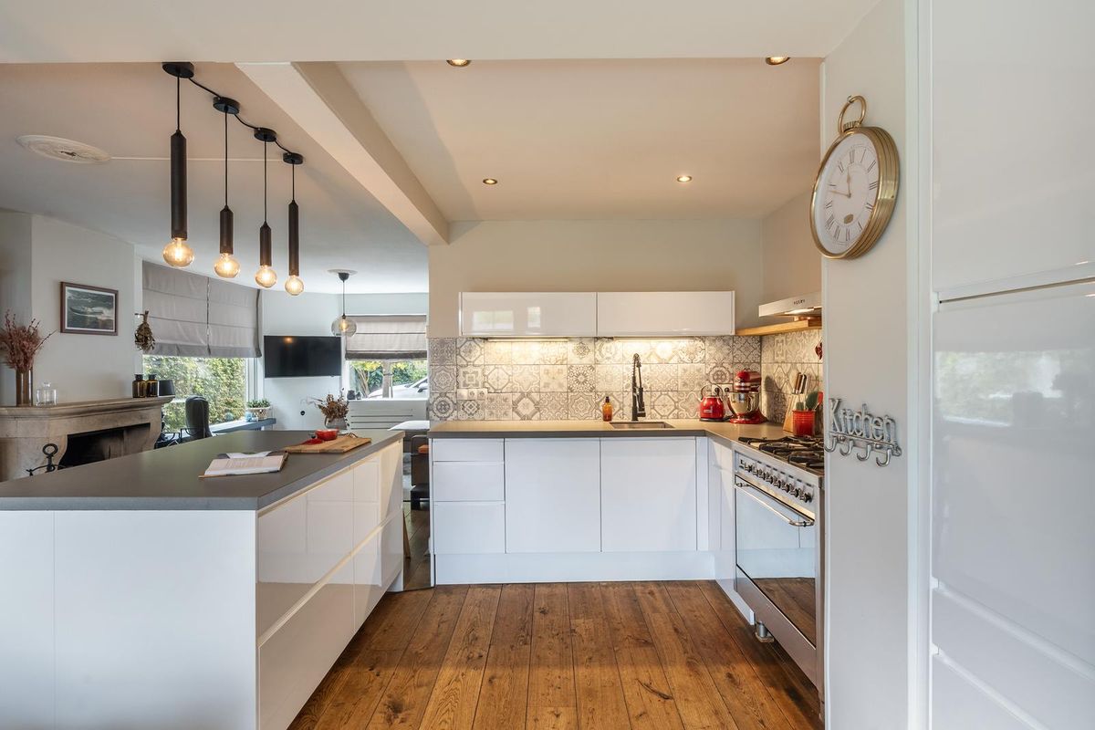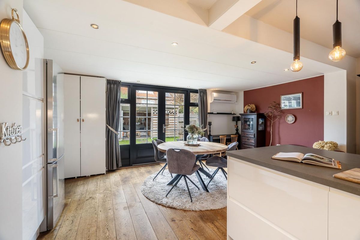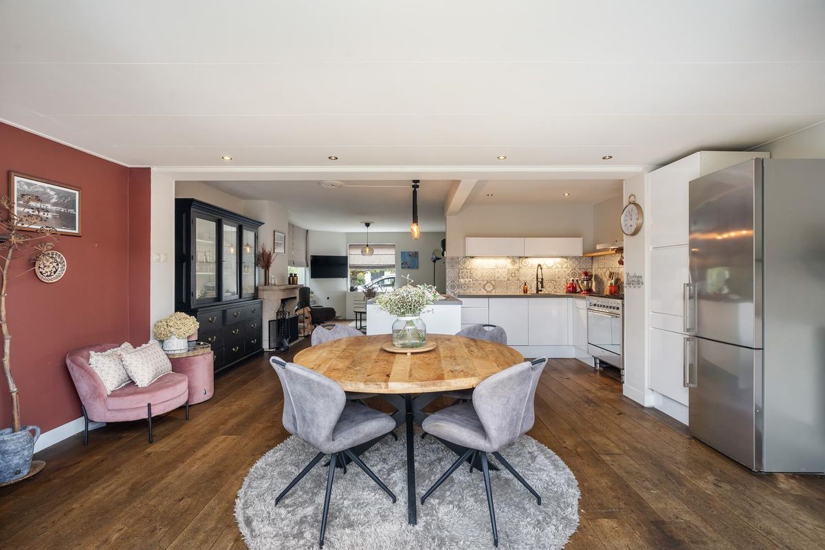 De halfopen keuken in L-opstelling met kookeiland vormt het hart van het huis en is voorzien van diverse inbouwapparatuur, waaronder een vaatwasser, 6-pits gasfornuis, oven, koel-/vriescombinatie en een moderne spoelkraan. Dankzij de aanbouw is er aansluitend een royale eetkamer met openslaande deuren naar de tuin.