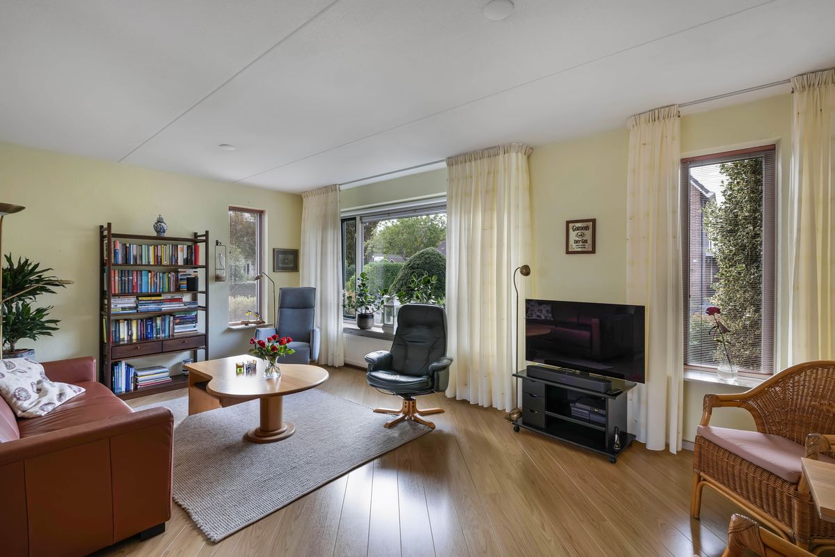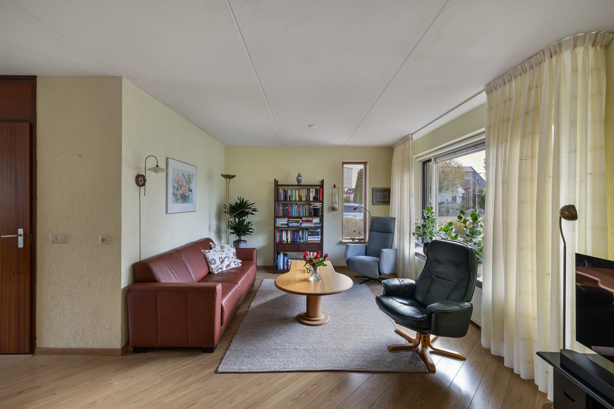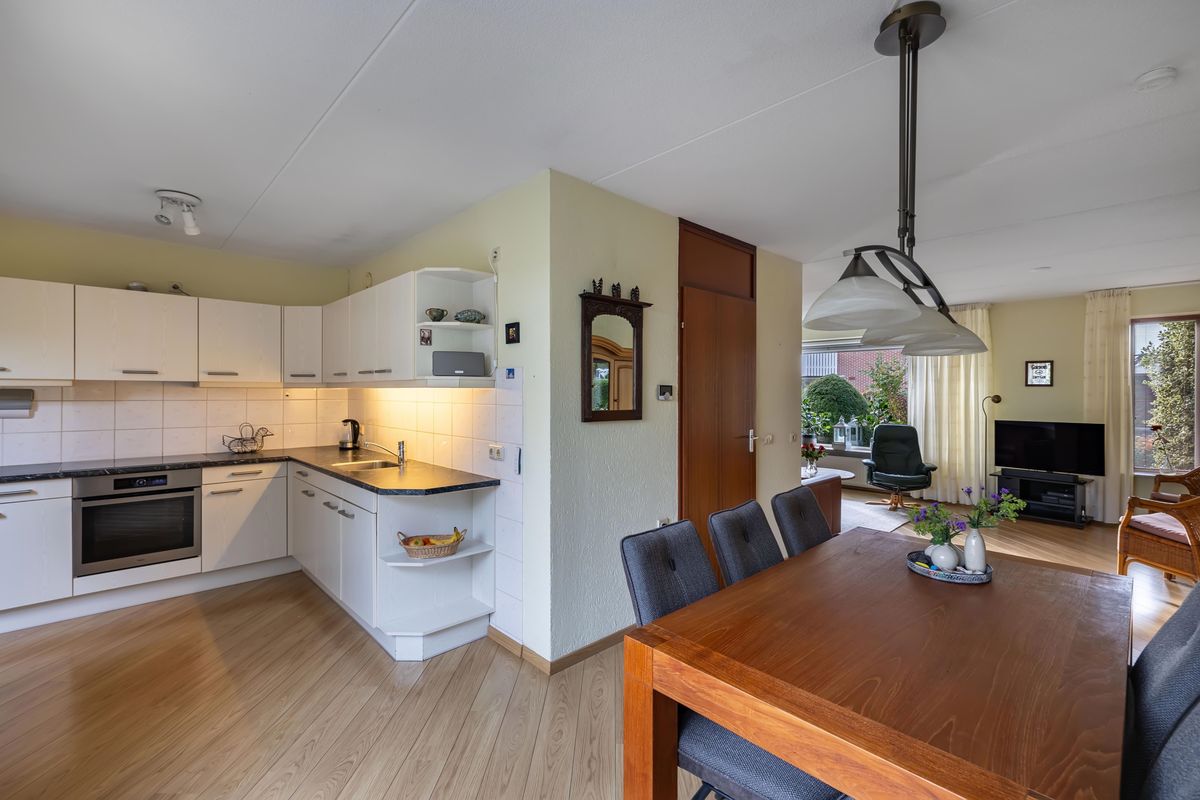 De woonkamer ligt aan de voorzijde van de woning. Via de eetkamer kom je in de halfopen keuken. Via de aangrenzende bijkeuken kun je ook naar de garage.