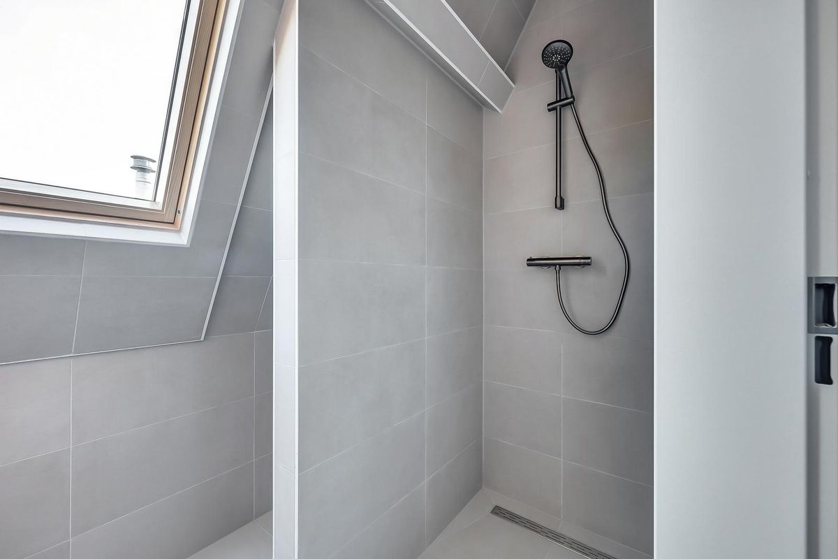 Moderne badkamer met douche, wastafel en wasmachineaansluiting
