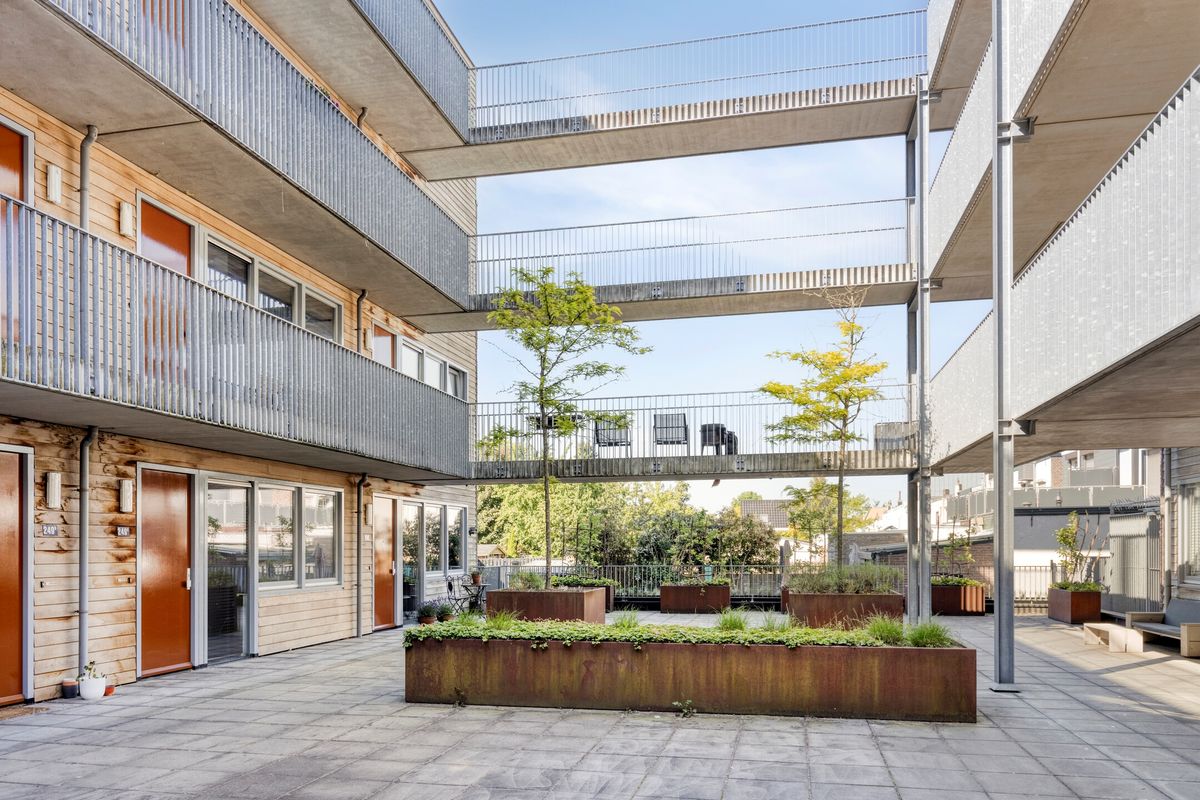 Aan de voorzijde ligt de gemeenschappelijke binnentuin, waardoor je voor je appartement heerlijk op een royaal terras in alle rust alleen of met vrienden kan genieten. Hier komt de middag- en avondzon.