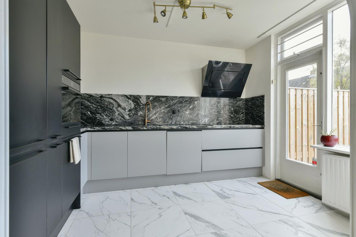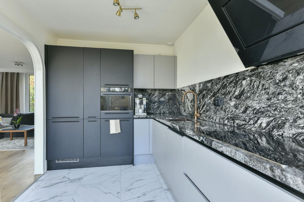 From the kitchen, the chef can easily join in on conversations in the living room while cooking. Here you will find a door leading to the backyard as well, with a window above the door that provides natural ventilation. The L-shaped kitchen unit is equipped with built-in appliances: a 4-burner induction hob, extractor hood, combi oven-microwave, dishwasher, and a tall refrigerator with a large freezer compartment. Furthermore, wall sockets are centrally located for maximum ease of use. In addition, there is plenty of workspace on the natural stone countertop and storage space in the kitchen cabinets with drawers under the hob, a carousel cabinet for pans, and a tall apothecary cabinet.