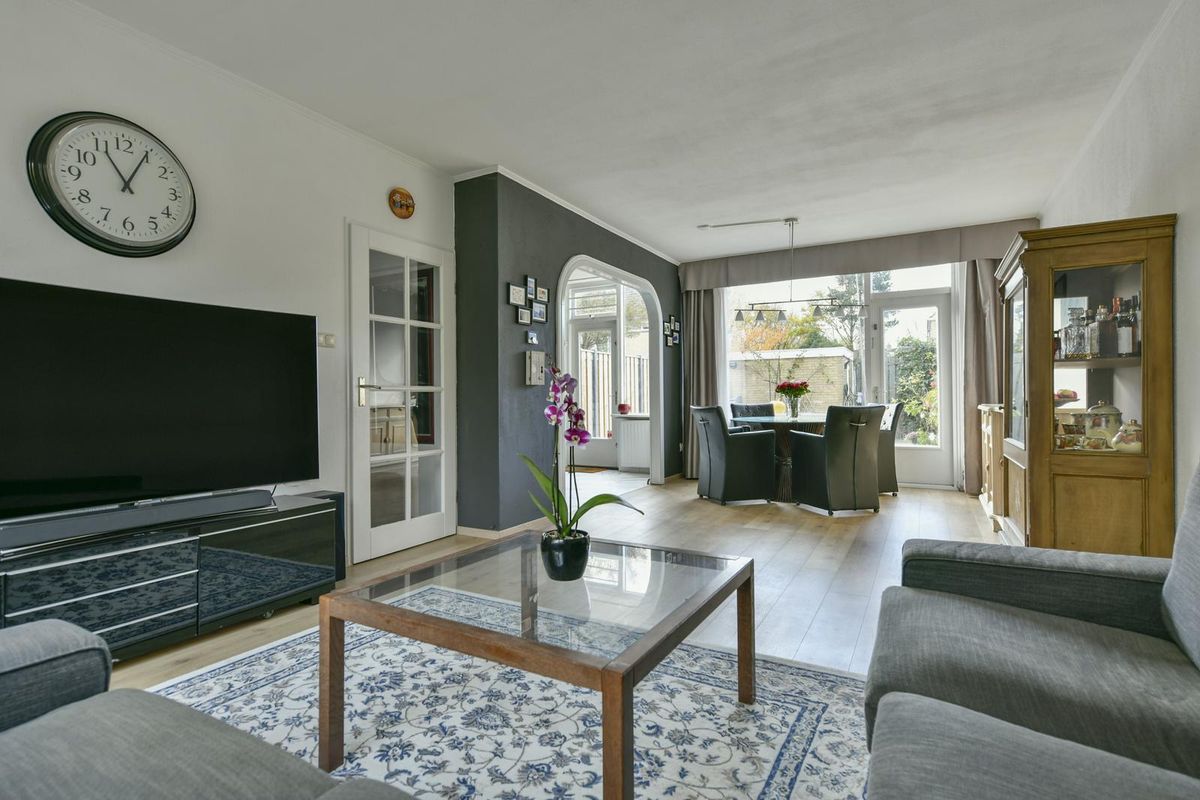 Als ware het kloppend hart van de woning is de ruime doorzon-woonkamer. Hier vind je meer dan voldoende plek voor het plaatsen van zowel een gezellige zithoek met grote familiesofa, salontafel, een eventuele luie stoel en televisiemeubel als een eettafel met bijpassende stoelen naar eigen indeling. Er is sprake van veel lichtinval dankzij de grote ramen en een openslaande deur biedt directe toegang tot de grote achtertuin. Met een leuke sierboog staat de woonkamer tevens in verbinding met de half-open keuken, die handig naastgelegen is gepositioneerd aan de achterzijde van het pand.
