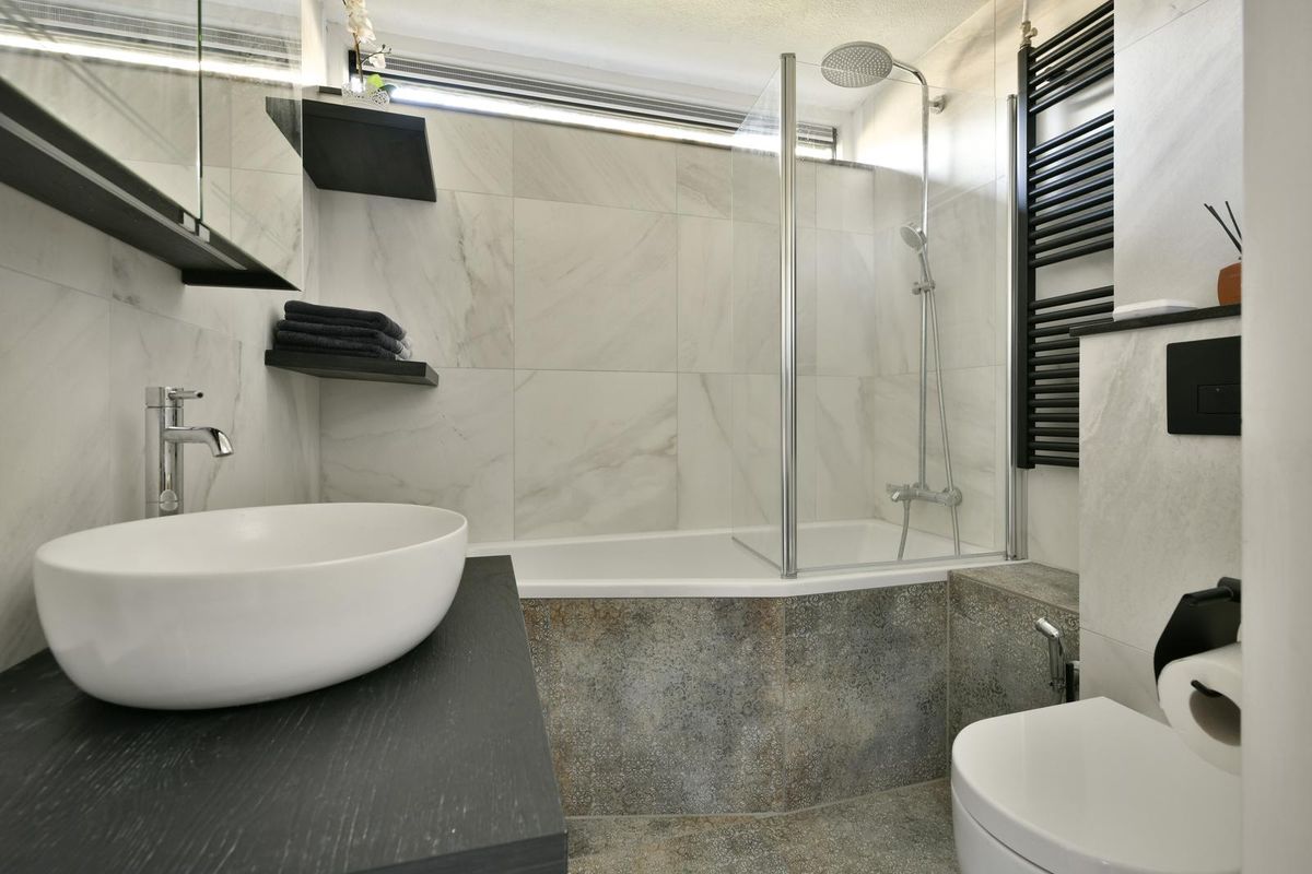 - Moderne badkamer met ligbad, douche, wastafel, designradiator en toilet;