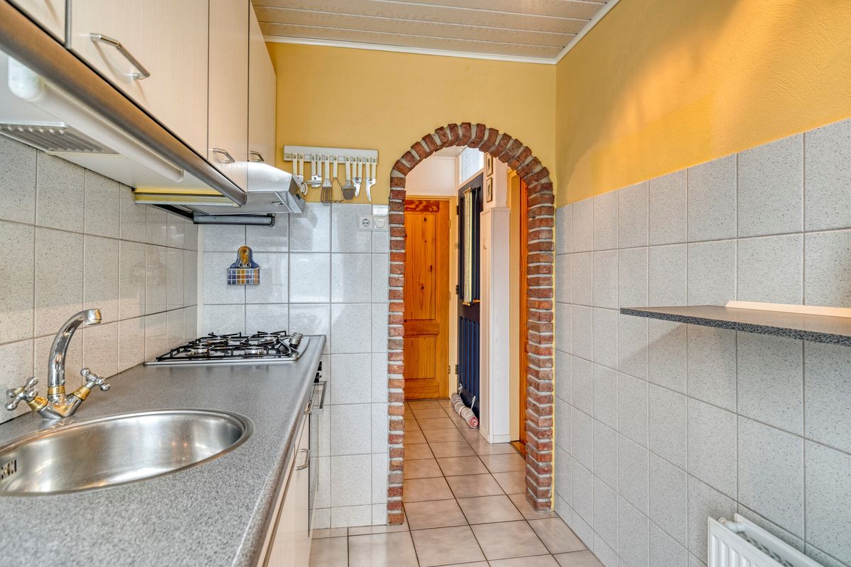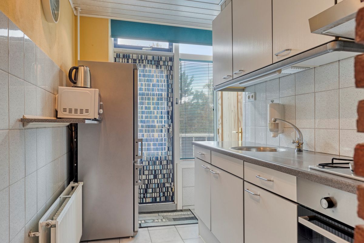 De instapklare keuken grenst aan de hal. Deze beschikt over een langwerpig aanrecht en heeft een gasfornuis en spoelbak. Witgoedaansluitingen maken het mogelijk om een vaatwasmachine en wasmachine te plaatsen.