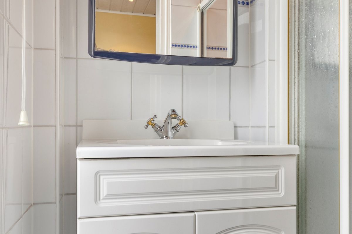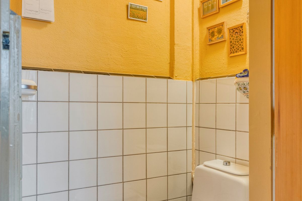 Grenzend aan de keuken is de badkamer gesitueerd. Deze is betegeld en beschikt over een ruime inloopdouche met glazen wand, wastafel met spiegel. De toiletruimte is separaat aanwezig en grenst aan de hal.