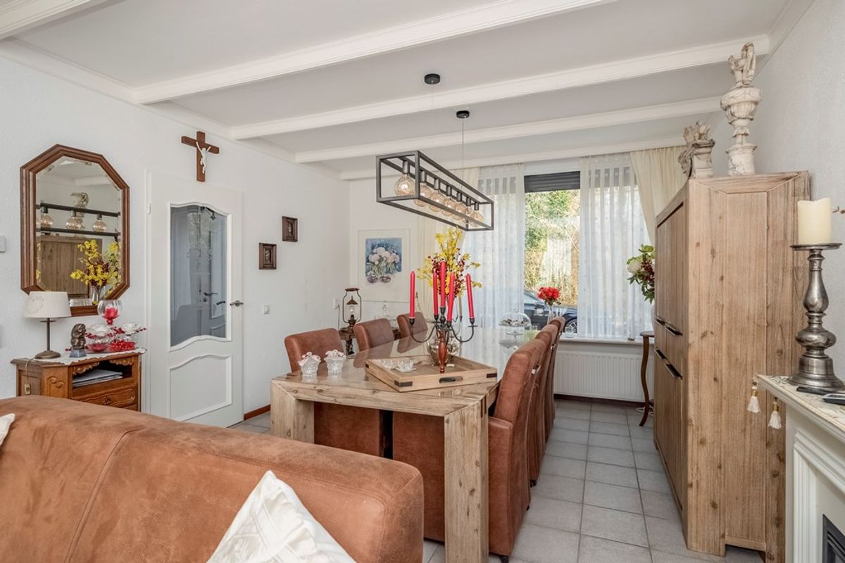 Lichte woon/eetkamer voorzien van grote raampartijen en een sfeervolle schouw met elektrische haard.