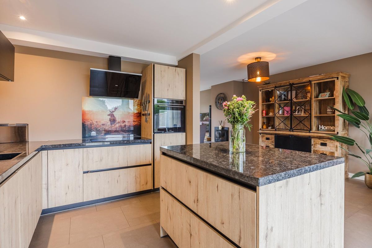 Vanuit de keuken is er toegang tot de tuin door de grote schuifpui alsook via de garage met openslaande deuren. In de kast tegen de achterwand van de garage zijn de warmtepomp en warmteboiler uit het zicht weggewerkt.
