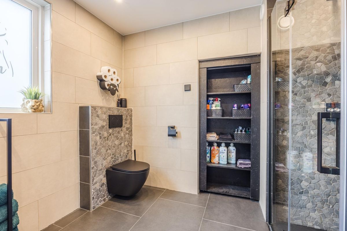 Overloop met trapopgang naar de tweede verdieping, 3 slaapkamers en de badkamer met doorgang naar de inloopkast met opstelplaats van de wasmachine en de wasdroger. Aan de voorzijde van de woning bevinden zich 2 slaapkamers, aan de achterzijde de 3e slaapkamer en de badkamer. De badkamer is in 2023 nog vernieuwd en is uitgerust met een dubbele wastafel, zwevend toilet en een douchehoek met regendouche. Achter de deur bevindt zich de riante berging/inloopkast.