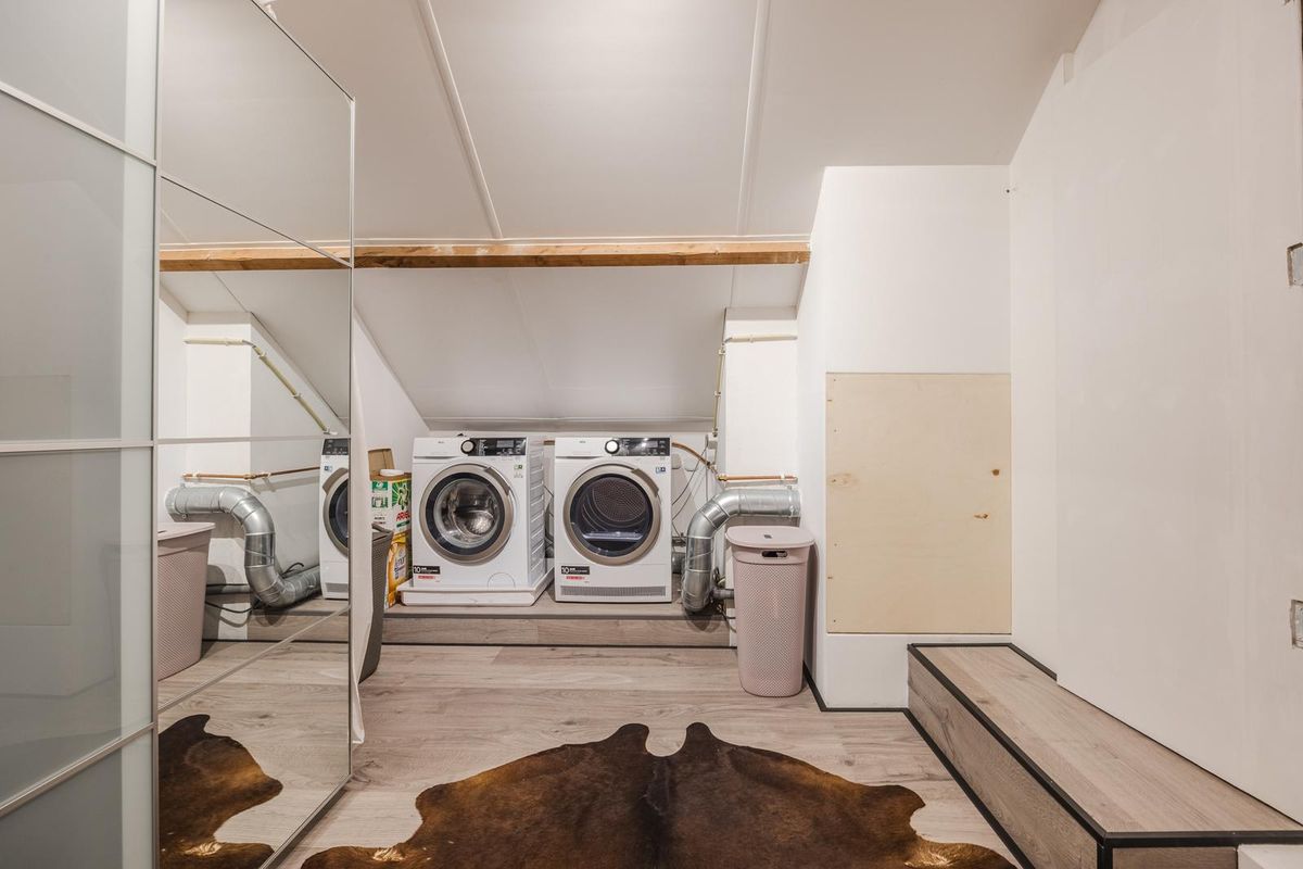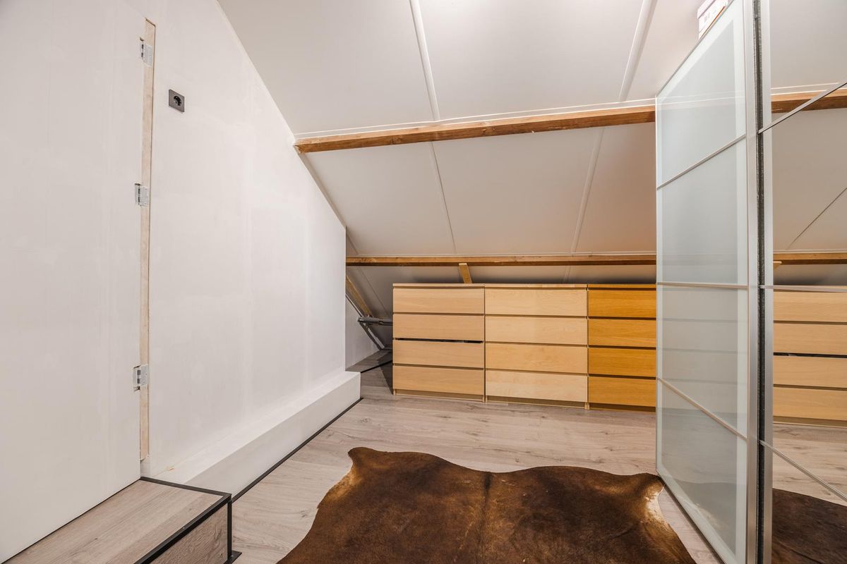 De zolderverdieping is vergroot door middel van een kunststof dakkapel van ruim 4 meter breed en is ingedeeld in een voorzolder met opstelplaats van de wtw-unit en bergruimte achter de schotten en een (slaap)kamer met luik naar de bergzolder en schuifdeuren naar de bergruimte onder het schuine dak.