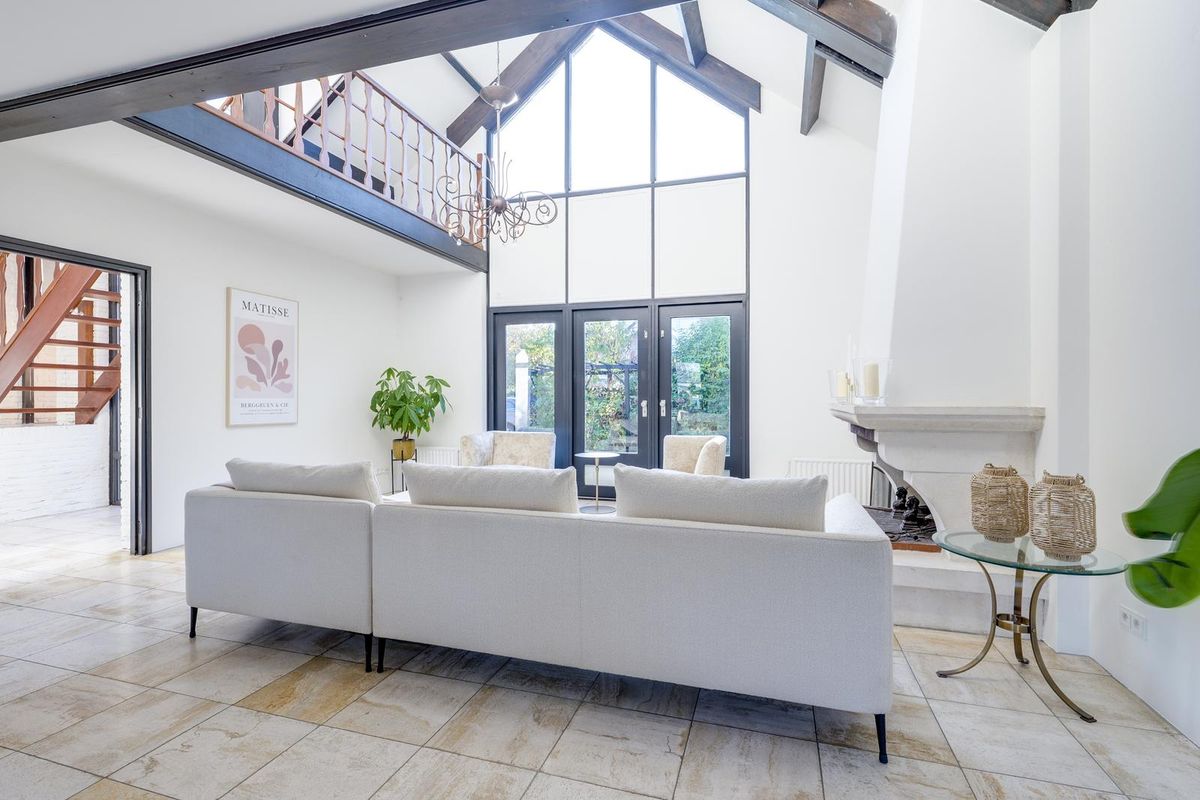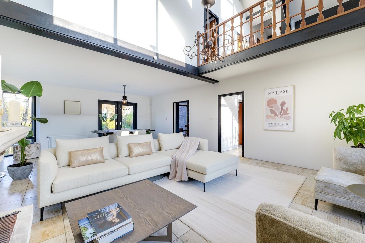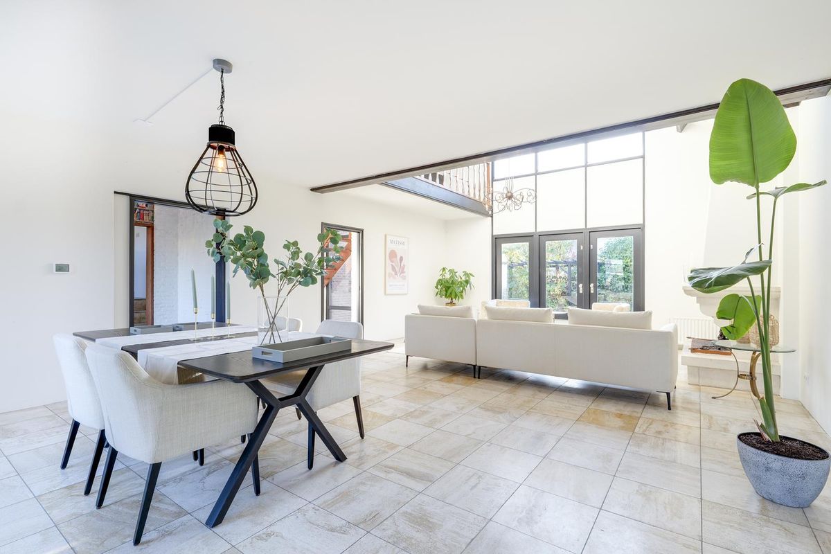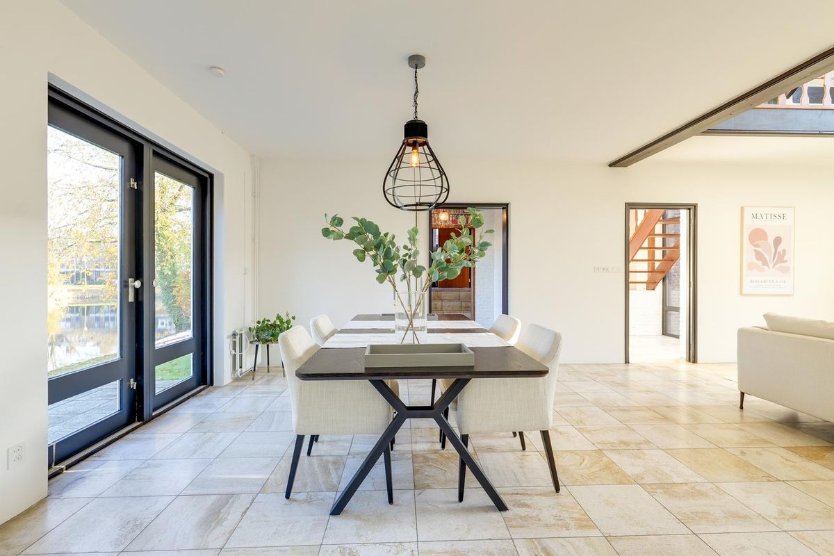 Een paar treden lager dan de hal is de woonkamer met een hoge vide en aan twee kanten openslaande deuren naar de tuin. Het houtwerk, geschilderd in een donkere kleur, zorgt samen met Franse haardpartij voor een leefruimte met een fantastische sfeer. Vanaf het zit- en het eetgedeelte heeft u mooi uitzicht naar de rondom gesitueerde tuin en aan de achterzijde ook richting het water.