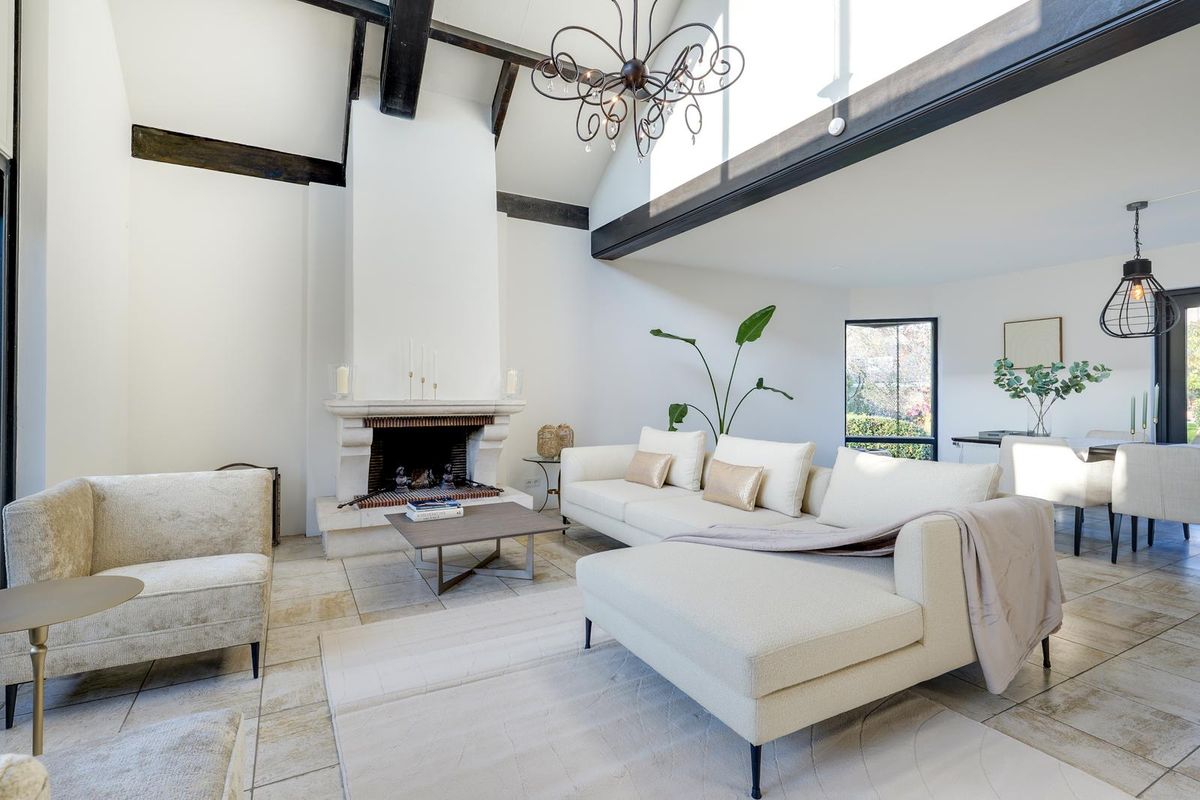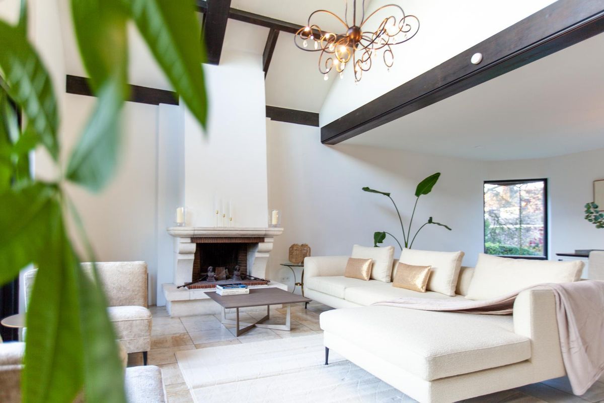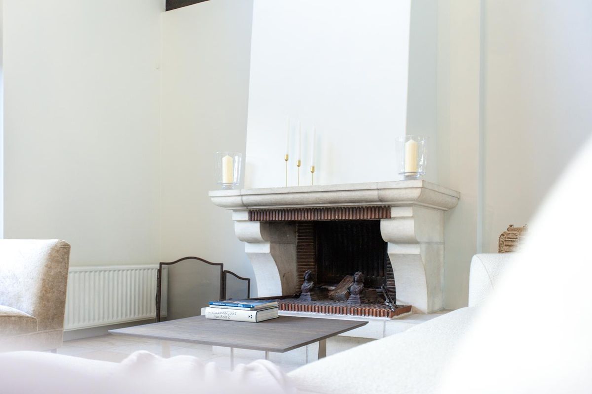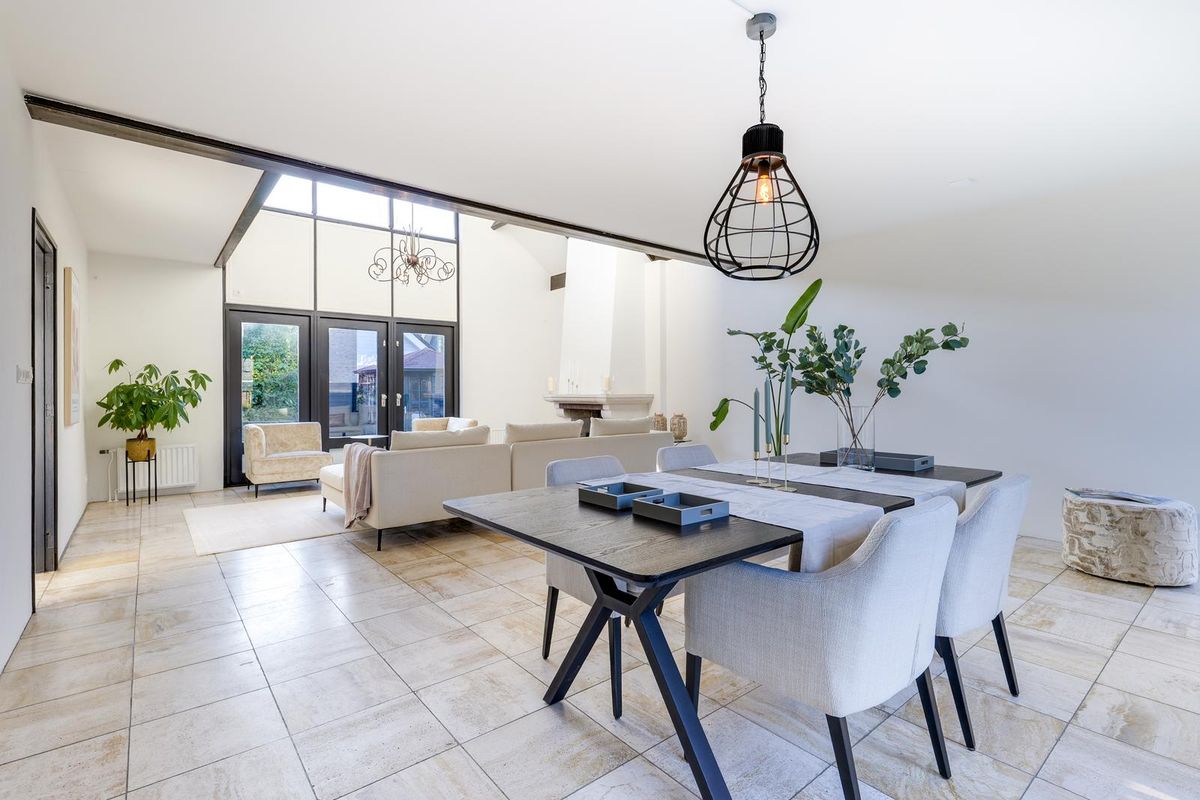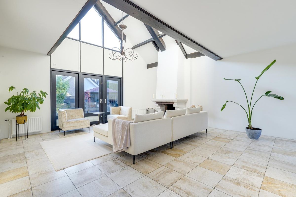 Een paar treden lager dan de hal is de woonkamer met een hoge vide en aan twee kanten openslaande deuren naar de tuin. Het houtwerk, geschilderd in een donkere kleur, zorgt samen met Franse haardpartij voor een leefruimte met een fantastische sfeer. Vanaf het zit- en het eetgedeelte heeft u mooi uitzicht naar de rondom gesitueerde tuin en aan de achterzijde ook richting het water.