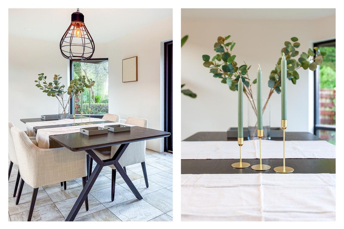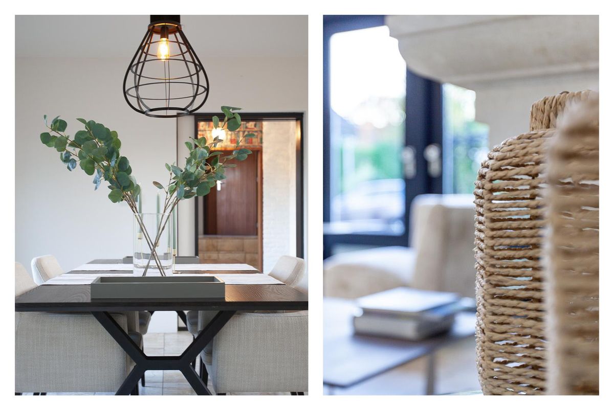 Het eetgedeelte staat via een leuke tussenruimte in verbinding met de keuken. Deze ruimte is geschikt als werk-/studeerplek, bibliotheek of speelkamer van de kinderen. In de keuken ziet u de travertinvloer terugkomen, die bij verschillende keukenstijlen past. De keukenopstelling in L-vorm is voorzien van diverse inbouwapparatuur, voor de wasapparatuur is er een aparte ruimte en de andere ruimte is geschikt als berging/provisieruimte.