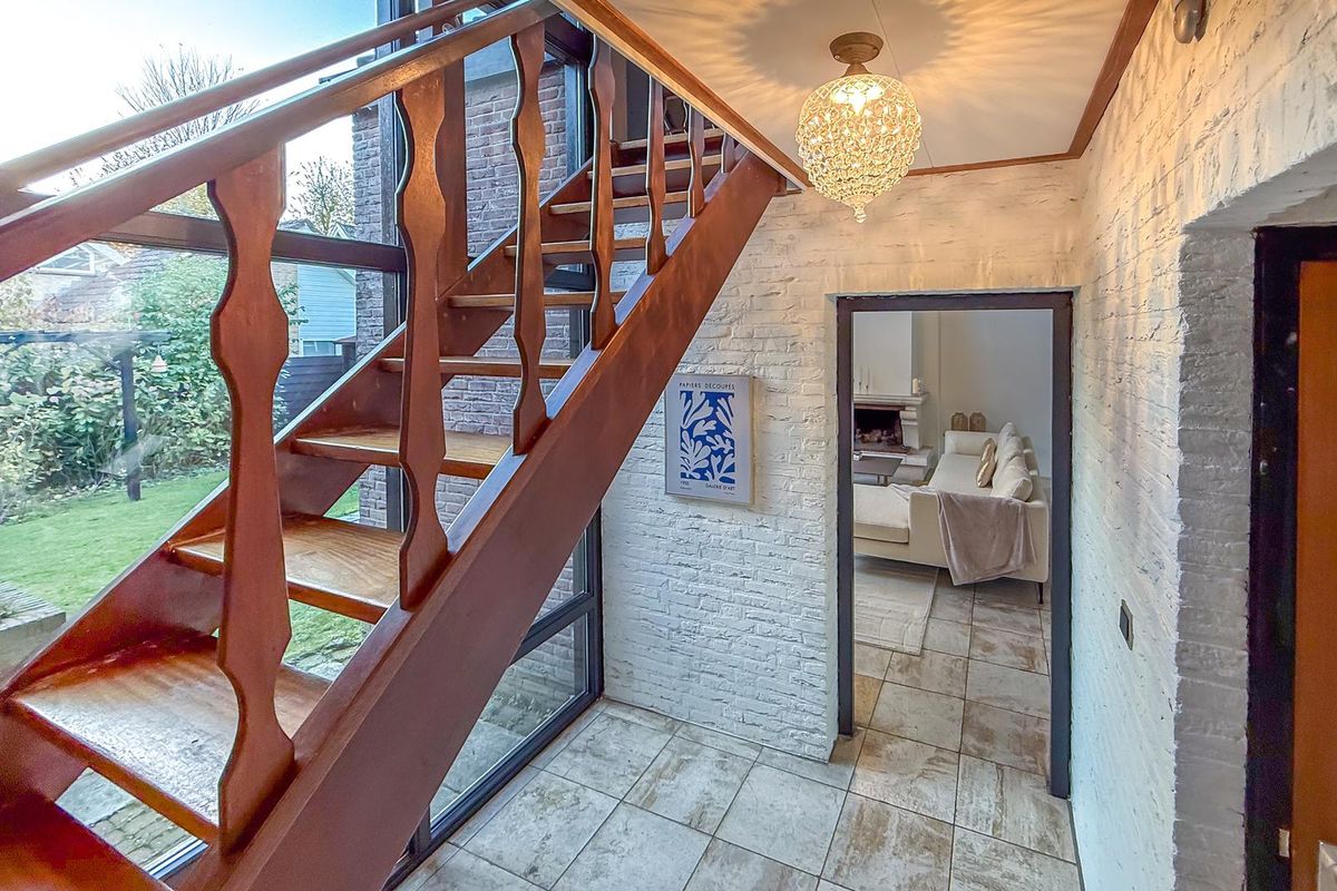 Bewonder de uitstraling van deze villa en loop via de buitentrap naar de overdekte entree. De ontvangsthal is een prachtige ruimte met een splitlevelindeling en een stijlvolle travertinvloer. Door de grote raampartij valt veel licht naar binnen en aan de rechterzijde is de garderobe, tegenover de meterkast.
