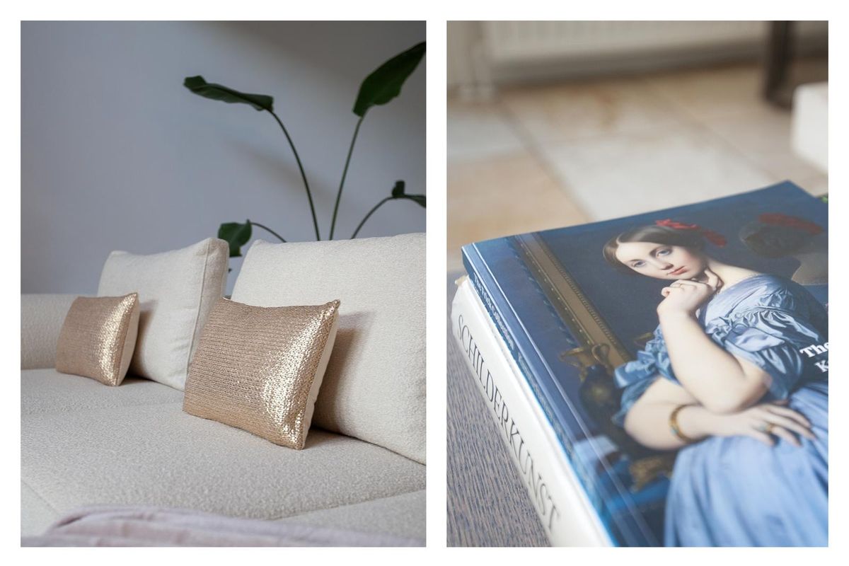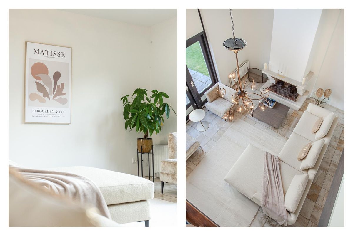 De overloop, met een subtiel niveauverschil, vormt het hart van deze etage. Fraaie elementen zijn de verbinding met de woonkamer, de grote ramen en de donkere balken die het dak dragen.