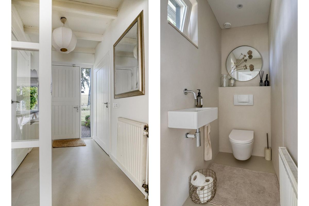 Vanuit de eetkamer is de gang met badkamer, slaapkamer en trap naar de verdieping bereikbaar. De badkamer is recent vernieuwd en mooi afgewerkt met Beton Ciré, wat een moderne en warme beton look geeft. De luxe badkamer is compleet uitgevoerd met dubbel wastafelmeubel, inloopdouche met glazen douchedeur, ligbad, tweede hangtoilet en fraai geborsteld messing kraanwerk.