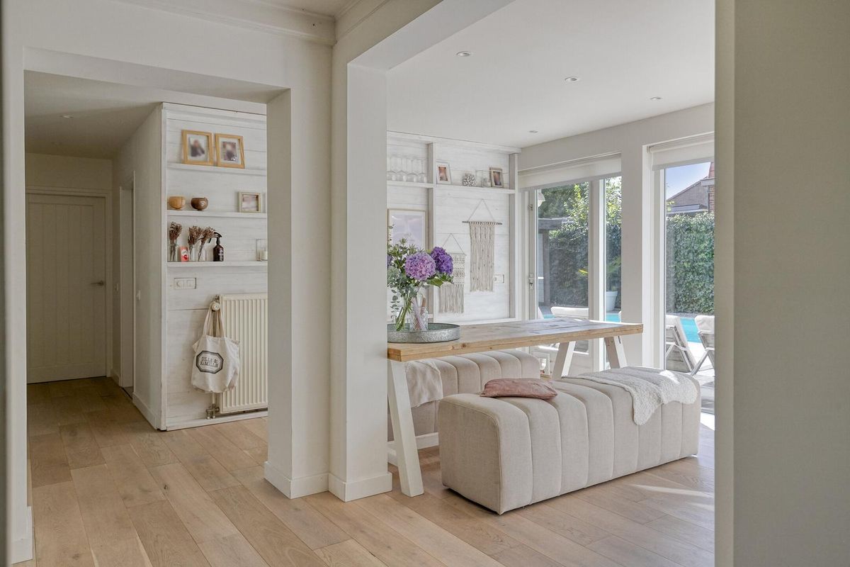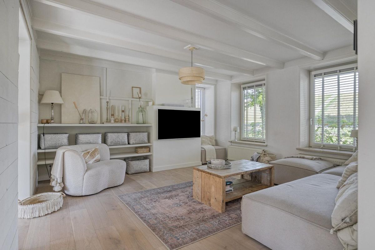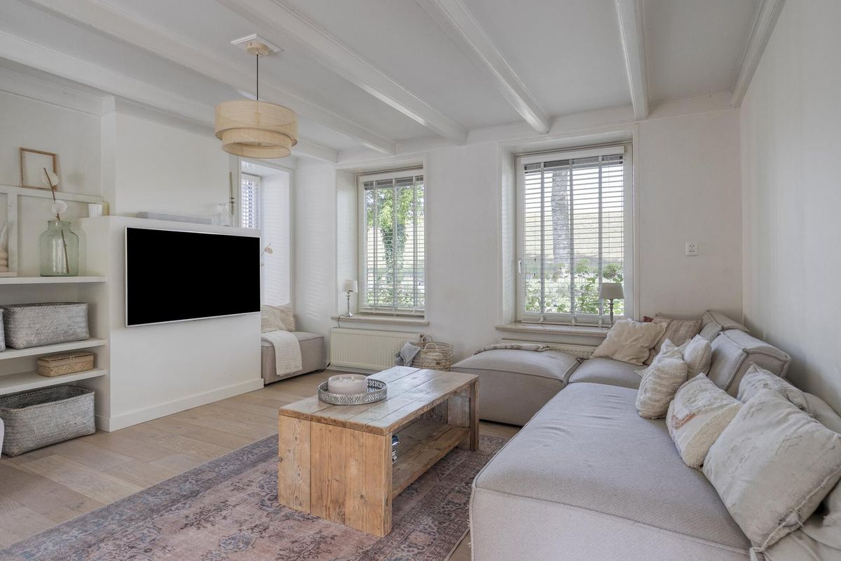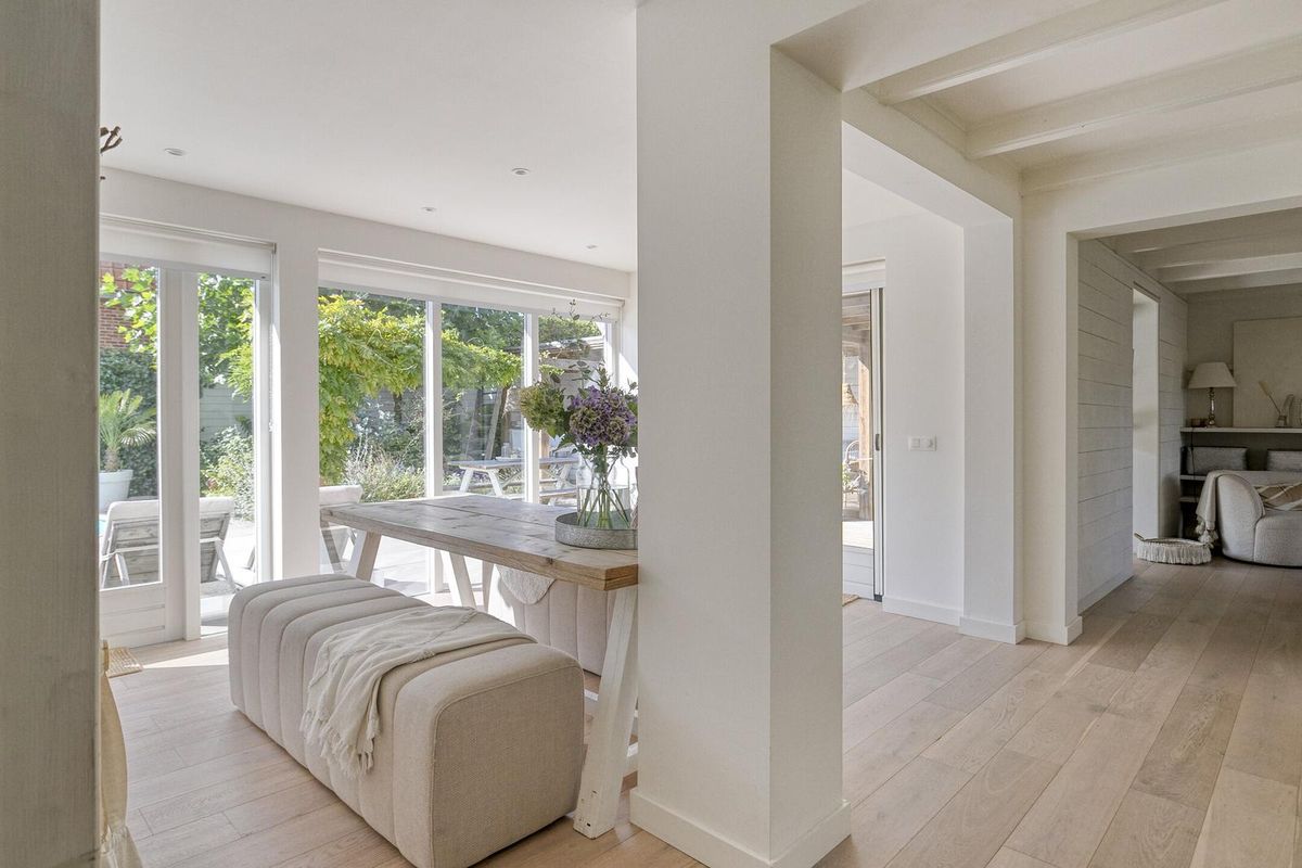 Via de glazen deur kom je in het royale leefgedeelte, wat speels verdeeld is in de woon-/zitkamer en eetkamer met half open keuken. Door gebruik van natuurlijke materialen en zachte kleuren, gezellige zithoek, grote ramen met veel natuurlijk licht die voor een heerlijke verbinding met de tuin zorgen, heerst er een rustgevende en ontspannen sfeer.
